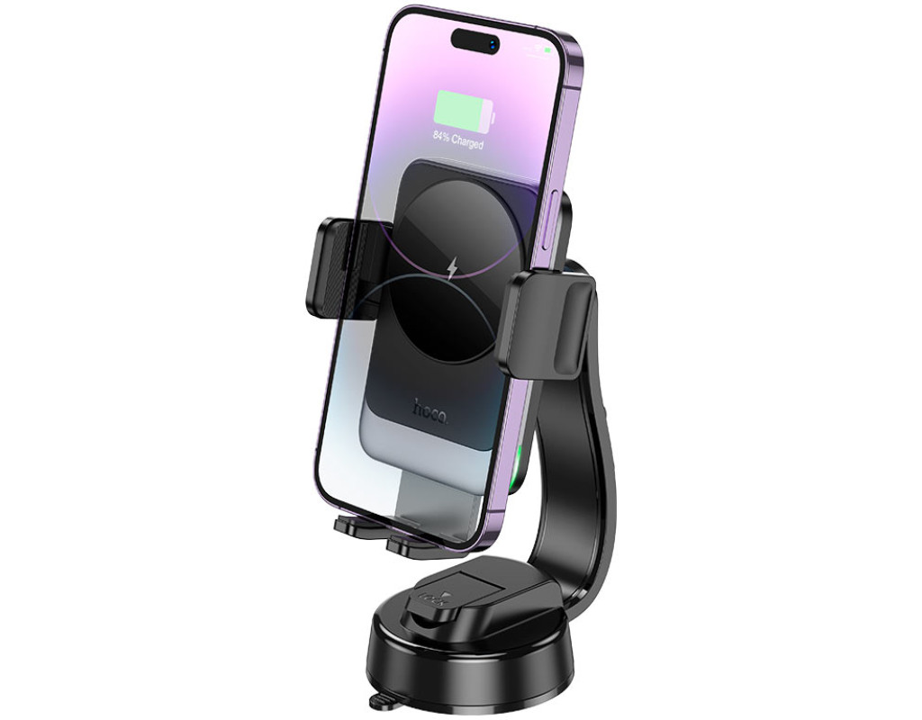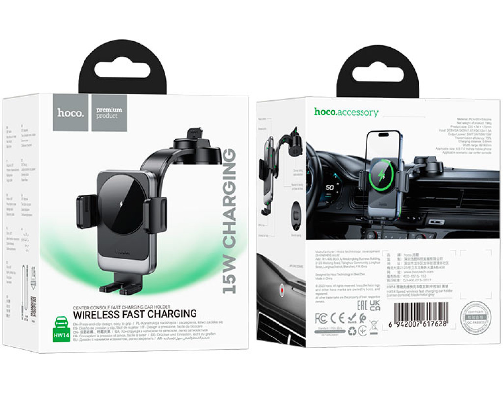Автоутримувач HOCO HW14+ Wireless Charging 15W, кріплення на торпеду, затискач 55-90мм, Black, Box