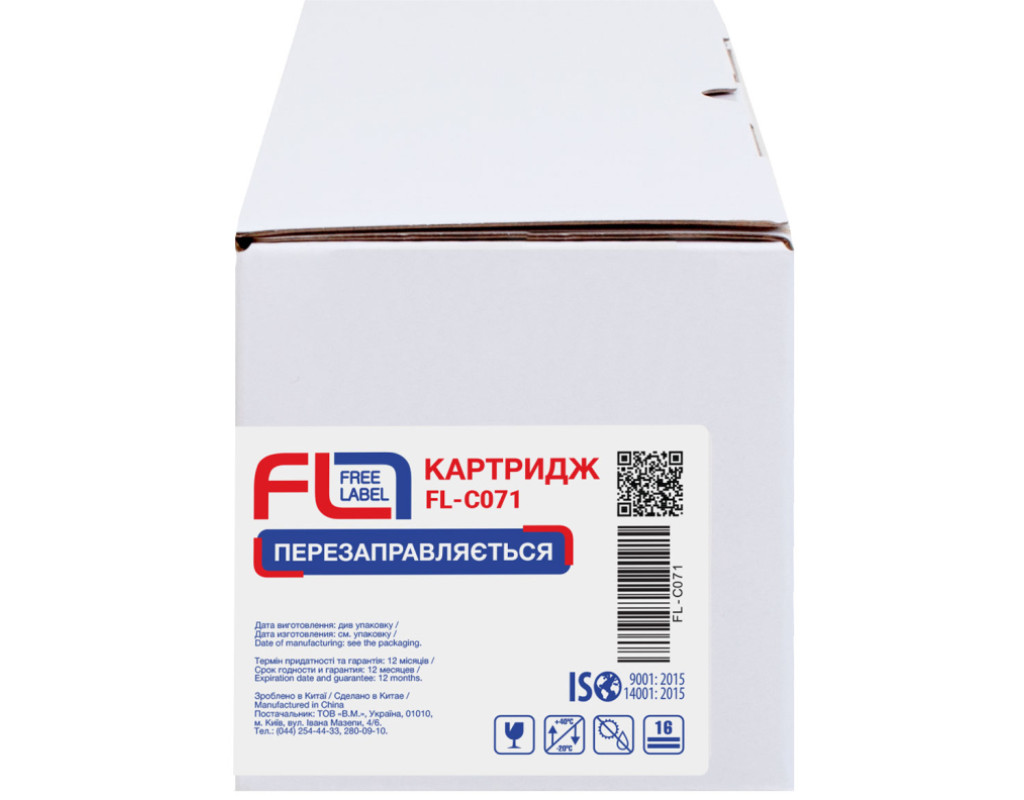 Сумісний картридж Canon C071 Free Label є достойною альтернативою оригінальним витратним матеріалам, який дає можливість економити. Картридж сумісний Canon 071 Free Label (FL-C071) має гарантію АТ000953 безперебійної роботи картриджа і ми зробимо заміну продукції в разі виявлення виробничого дефекту. Ресурс сумісного картриджа C071 Free Label складає 1200 сторінок, що відповідає ресурсу відповідного оригінального картриджа. Картриджі (cartridge) серії Free Label виробляються в Китаї з використанням нових корпусів та пристосовані для перезаправки. Вони забезпечують чіткий та насичений друк – Ваші документи будуть виглядати так само презентабельно. Основні особливості: Вартість картриджів серії Free Label в середньому на 80-90% нижче оригінальних витратних матеріалів. Мінімальна вартість та прийнятна якість забезпечує привабливість даної серії для клієнтів. Ресурс картриджів залежить від заповнення сторінки під час друку. Стандартний текст (не жирний, без підкреслень, без малюнків) дає приблизне заповнення 5%. Це стандартна характеристика заповнення тонером поверхні паперу і на її основі розраховується ресурс витратних матеріалів. Вказане вище значення ресурсу є орієнтовним та може відрізнятися для різних моделей пристроїв друку. Перед тим як придбати картридж для принтера Canon, необхідно пересвідчитися, що обраний картридж C071 підходить до Вашого друкуючого пристрою. |
