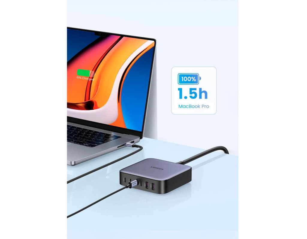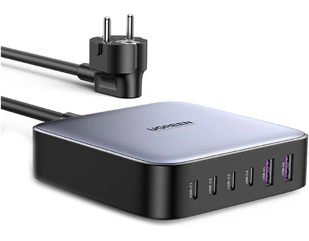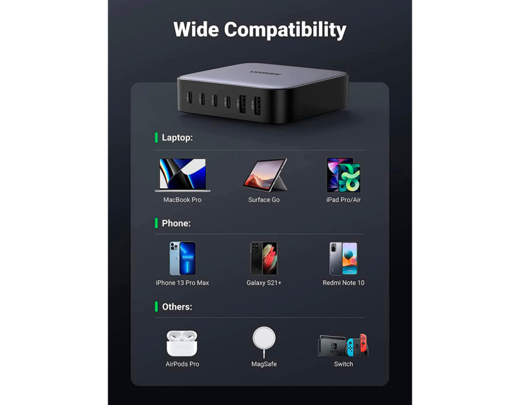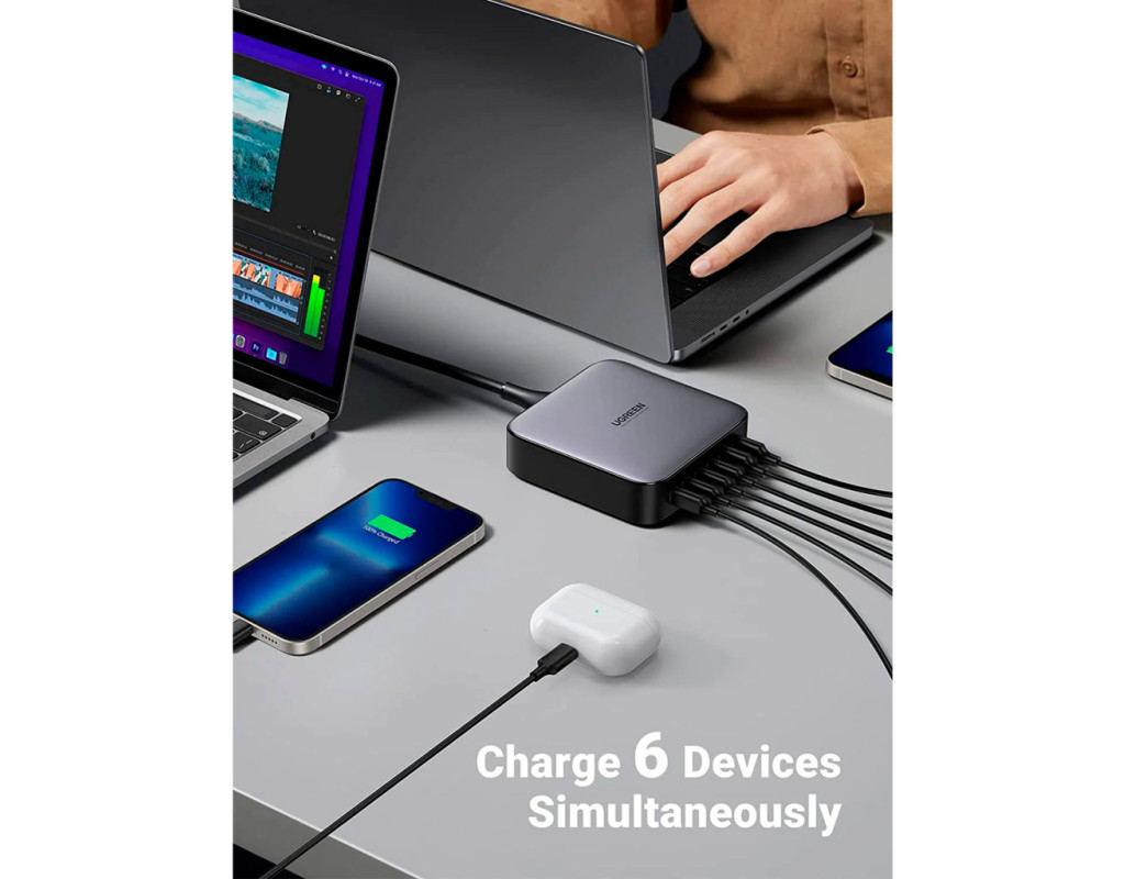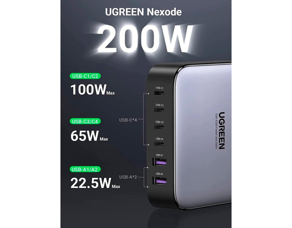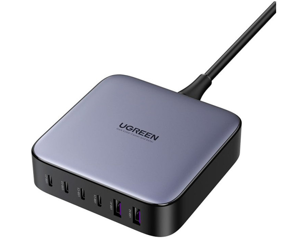 Многопортовое зарядное устройство выходной мощностью 200 Вт Ugreen 6xUSB 200W GaN (4хUSB-C+2xUSB-A) CD271 (40914) предназначено для быстрой зарядки смартфонов, планшетов, ноутбуков и других USB Type-А и USB Type-С устройств.