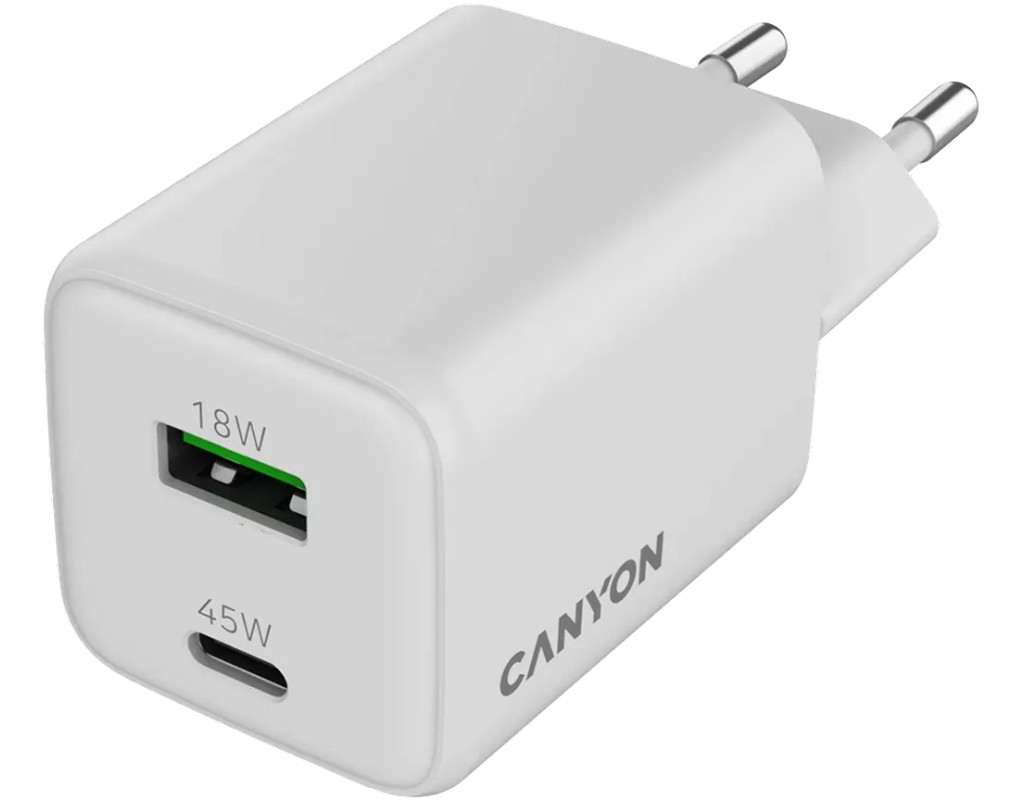 Зарядное устройство Canyon CU45AC GaN 45W 1xPD 1xQC EU White (CNS-CUW45AC)