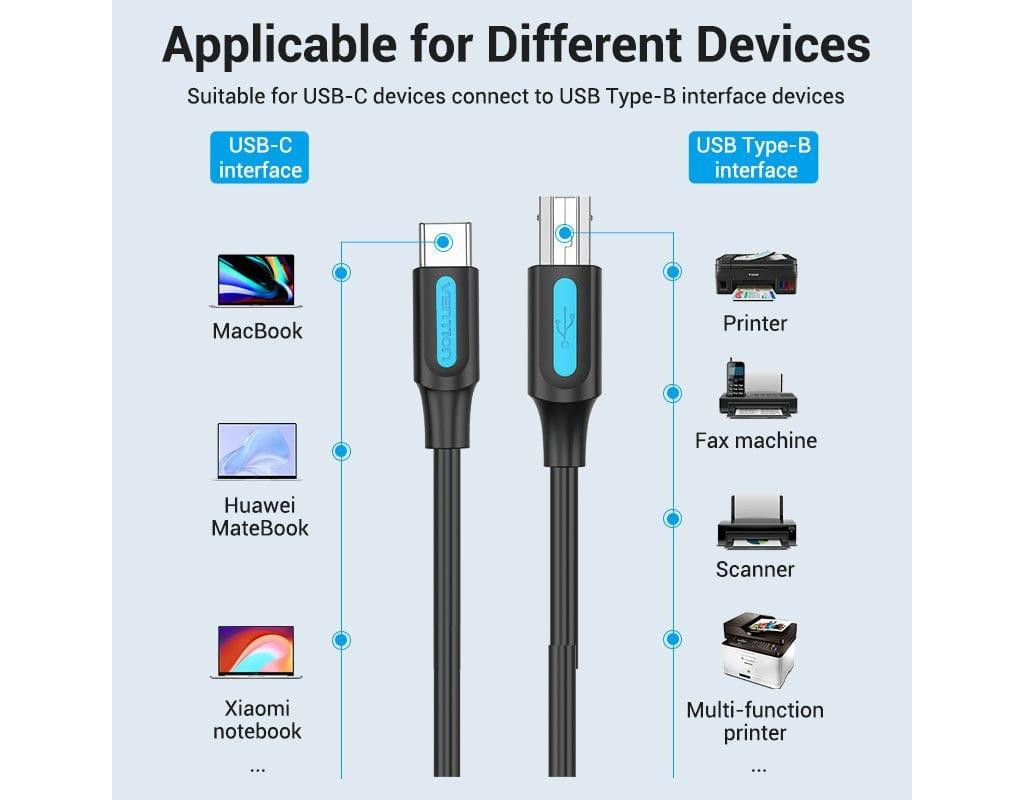 | Кабель для принтера Vention USB Type C - B Male Print – используется для подключения к компьютеру принтеров, сканеров и любой USB-совместимой периферии. Кабель изготовлен из высококачественного полихлорвинила, жилы проводников отлиты из чистой бескислородной меди, а изолятор изготовлен из вспененного полиэтилена. Неразборная конструкция разъема залита гибким пластиком, что обеспечивает надежность и долговечность проволоки. |
