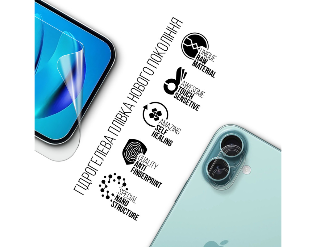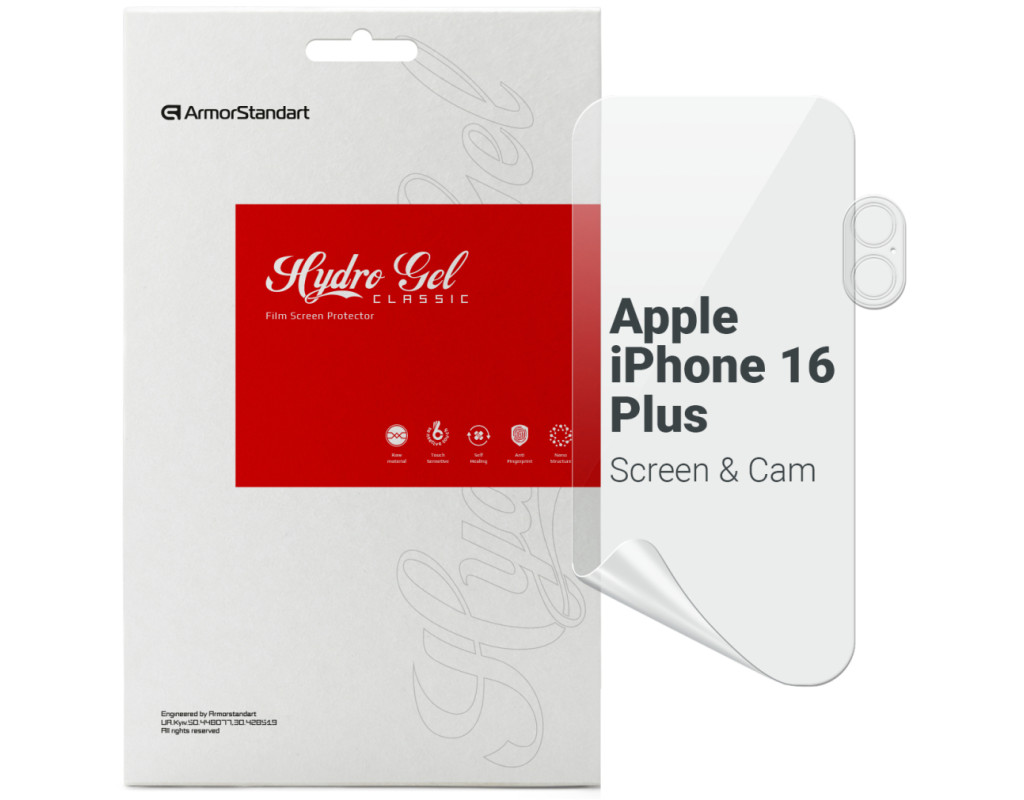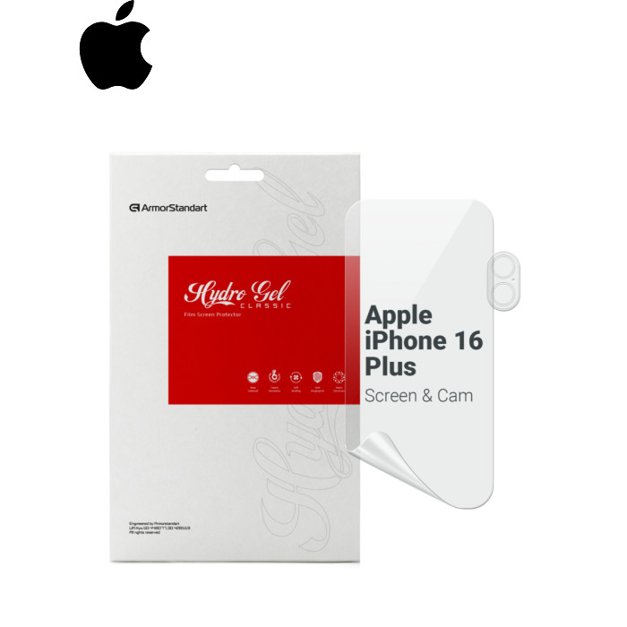 Назначение - для телефона, Вид покрытия - глянцевое, гидрогелевая, Совместимость с моделями - Apple iPhone 16 Plus, Особенности - + пленка для блока камер, Количество в упаковке - 1 шт