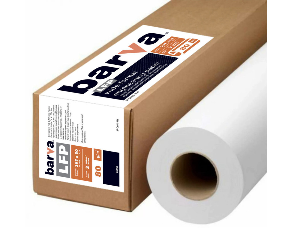 Папір широкоформатний інженерний 80 г/м2, 297 мм x 50 м LFP Barva (IP-O080-356) призначений для друку на широкоформатних струменевих друкуючих пристроях. Може використовуватися для друку як водорозчинними, так і пігментними чорнилами. Для використання даного паперу Ваш принтер повинен підтримувати рулонний друк. Папір широкоформатний,основні характеристики: