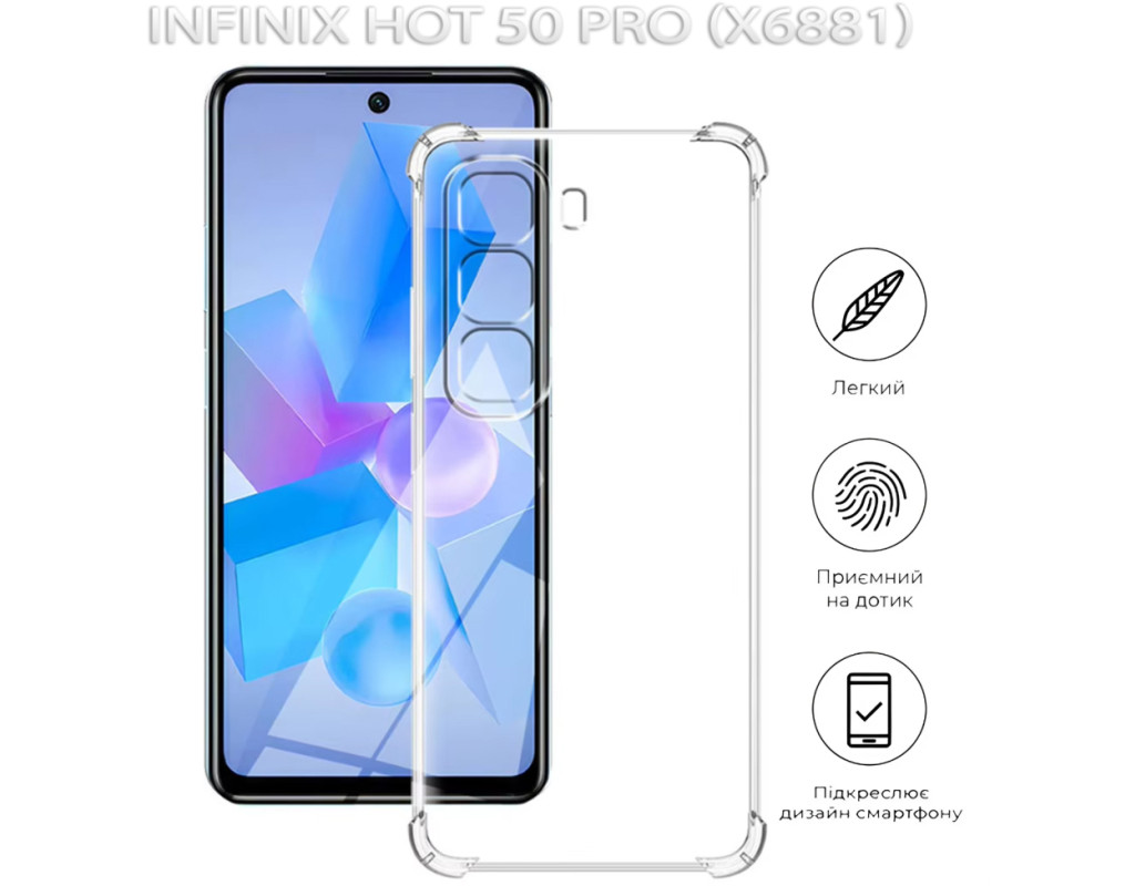 совместимость с моделями - Infinix Hot 50 Pro, Тип чехла для телефона - накладка, Назначение - модельный, Цвет - прозрачный