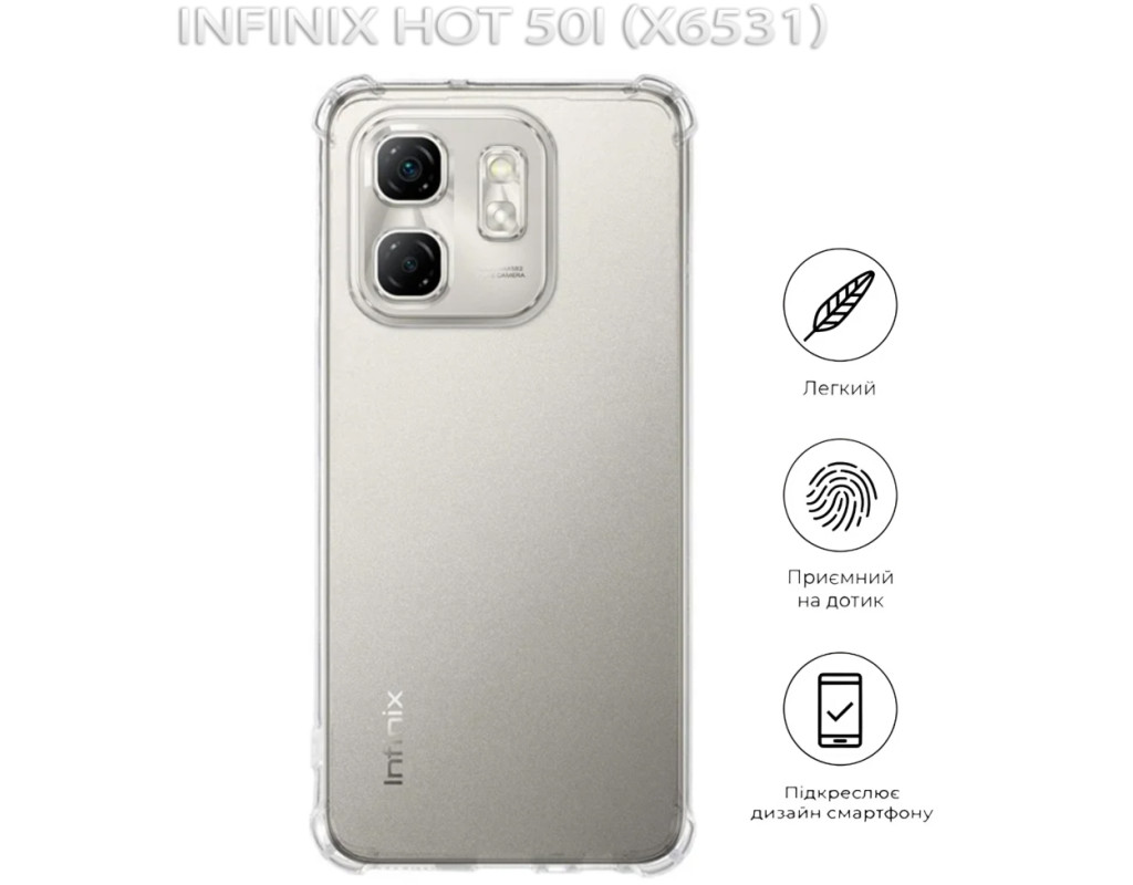 совместимость с моделями - Infinix Hot 50i, Тип чехла для телефона - накладка, Назначение - модельный, Цвет - прозрачный