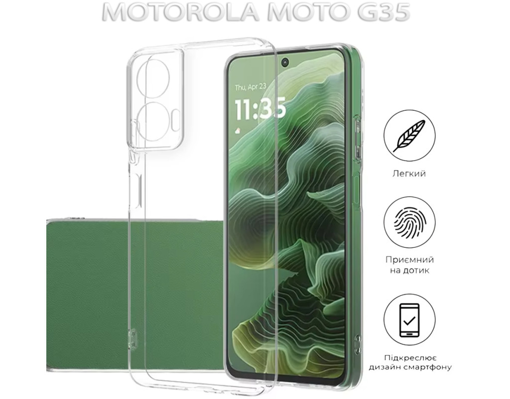 совместимость с моделями - Motorola G35, Тип чехла для телефона - накладка, Назначение - модельный, Материал - силикон, Цвет - прозрачный
