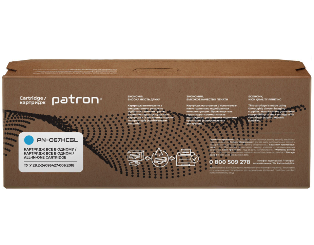 | Картридж сумісний Canon 067H жовтий Green Label Patron (PN-067HYGL) оптимальне рішення для лазерних принтерів та БФП. Основні властивості Детальна інформація: Що таке сумісний картридж? Кожен користувач друкувальної техніки стикається з питанням купівлі нового картриджа і знаходить досить велику кількість пропозицій. Як зробити правильний вибір? Розглянемо основні варіанти: Виробники друкувальних пристроїв (т.з. OEM виробники) наполягають на використанні оригінальних картриджів. Їх основний недолік - висока вартість. Сумісні картриджі виробляються різними компаніями - сторонніми виробниками. Вони дають можливість істотно заощадити на друці, проте питання оптимального балансу між якістю друку, ціною, гарантією та ресурсом картриджа залишається вибором Покупця. Картридж сумісний Canon 067H жовтий Green Label Patron (PN-067HYGL) гарантія Ми гарантуємо 12 місяців справної роботи картриджа та проведемо заміну продукції з виробничим дефектом. Якість друку Картриджі серії Patron Green Label виготовляються з використанням нових корпусів та повністю придатні для повторної заправки. Основна відміна серії Patron Green Label від картриджів низького цінового сегменту – якість комплектуючих, що забезпечує високу оптичну щільність друку, а також ресурс, аналогічний оригінальному картриджу. При виробництві картриджів Patron Green Label виробник дотримується загального стандарту ISO 9001:2015 і спеціальні стандарти, що використовуються в індустрії друку - ISO 19752:2017 для монохромних картриджів ISO 19798:2017 - для кольорових картриджів, а також STMC стандарт для контролю ресурсу. Захист навколишнього середовища Виробництво картриджів Patron Green Label відбувається з виконанням вимог міжнародного стандарту по захисту навколишнього середовища - ISO 14001:2015. Залишки матеріалів і комплектуючих, що використовуються для виробництва картриджів Patron Green Label, передаються на утилізацію відповідно Закону України "Про відходи". Для виробництва картонної упаковки ми використовуємо перероблені матеріали з нанесенням мінімальної кількості фарби. А конструкція коробки для картриджа дозволяє кілька разів відкривати і закривати його на "замок" для транспортування в сервісний центр. Ми закликаємо до нанесення мінімального впливу на довкілля. Тому заправляйте і відновлюйте картриджі Patron Green Label. Картридж сумісний Canon 067H жовтий Green Label Patron (PN-067HYGL) економія на офісному друці Вартість картриджів серії Patron Green Label в середньому на 70-80% нижче оригінальних витратних матеріалів. Оптимальне співвідношення ціна-якість робить дану продукцію хорошим вибором для Клієнтів, що бажають заощадити на друці і не прогадати з якістю. Зовнішній вигляд Ми потурбувалися про те, щоб упаковка картриджа була не лише екологічною, функціональною, мала мінімально можливі фізичні розміри, але і містила усю необхідну інформацію. На зеленій етикетці знаходиться інформація про картридж, його сумісність з друкувальними пристроями, номер партії, дата виготовлення, контакти виробника, а також номер телефону безкоштовної гарячої лінії для українських споживачів. Сподіваємось, що наведена інформація дозволить Вам зробити правильний вибір. Ваш друк – наша турбота! Оптимальний варіант для користувача, що хоче заощадити;При виробництві картриджа використовується новий корпус;Гарантований ресурс;Економія 70-80% у порівнянні з оригінальними витратними матеріалами;