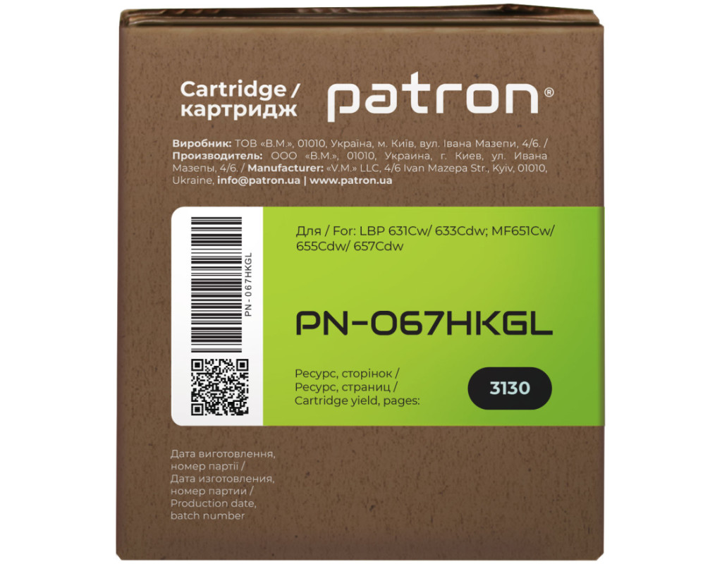 | Картридж сумісний Canon 067H жовтий Green Label Patron (PN-067HYGL) оптимальне рішення для лазерних принтерів та БФП. Основні властивості Детальна інформація: Що таке сумісний картридж? Кожен користувач друкувальної техніки стикається з питанням купівлі нового картриджа і знаходить досить велику кількість пропозицій. Як зробити правильний вибір? Розглянемо основні варіанти: Виробники друкувальних пристроїв (т.з. OEM виробники) наполягають на використанні оригінальних картриджів. Їх основний недолік - висока вартість. Сумісні картриджі виробляються різними компаніями - сторонніми виробниками. Вони дають можливість істотно заощадити на друці, проте питання оптимального балансу між якістю друку, ціною, гарантією та ресурсом картриджа залишається вибором Покупця. Картридж сумісний Canon 067H жовтий Green Label Patron (PN-067HYGL) гарантія Ми гарантуємо 12 місяців справної роботи картриджа та проведемо заміну продукції з виробничим дефектом. Якість друку Картриджі серії Patron Green Label виготовляються з використанням нових корпусів та повністю придатні для повторної заправки. Основна відміна серії Patron Green Label від картриджів низького цінового сегменту – якість комплектуючих, що забезпечує високу оптичну щільність друку, а також ресурс, аналогічний оригінальному картриджу. При виробництві картриджів Patron Green Label виробник дотримується загального стандарту ISO 9001:2015 і спеціальні стандарти, що використовуються в індустрії друку - ISO 19752:2017 для монохромних картриджів ISO 19798:2017 - для кольорових картриджів, а також STMC стандарт для контролю ресурсу. Захист навколишнього середовища Виробництво картриджів Patron Green Label відбувається з виконанням вимог міжнародного стандарту по захисту навколишнього середовища - ISO 14001:2015. Залишки матеріалів і комплектуючих, що використовуються для виробництва картриджів Patron Green Label, передаються на утилізацію відповідно Закону України "Про відходи". Для виробництва картонної упаковки ми використовуємо перероблені матеріали з нанесенням мінімальної кількості фарби. А конструкція коробки для картриджа дозволяє кілька разів відкривати і закривати його на "замок" для транспортування в сервісний центр. Ми закликаємо до нанесення мінімального впливу на довкілля. Тому заправляйте і відновлюйте картриджі Patron Green Label. Картридж сумісний Canon 067H жовтий Green Label Patron (PN-067HYGL) економія на офісному друці Вартість картриджів серії Patron Green Label в середньому на 70-80% нижче оригінальних витратних матеріалів. Оптимальне співвідношення ціна-якість робить дану продукцію хорошим вибором для Клієнтів, що бажають заощадити на друці і не прогадати з якістю. Зовнішній вигляд Ми потурбувалися про те, щоб упаковка картриджа була не лише екологічною, функціональною, мала мінімально можливі фізичні розміри, але і містила усю необхідну інформацію. На зеленій етикетці знаходиться інформація про картридж, його сумісність з друкувальними пристроями, номер партії, дата виготовлення, контакти виробника, а також номер телефону безкоштовної гарячої лінії для українських споживачів. Сподіваємось, що наведена інформація дозволить Вам зробити правильний вибір. Ваш друк – наша турбота! Оптимальний варіант для користувача, що хоче заощадити;При виробництві картриджа використовується новий корпус;Гарантований ресурс;Економія 70-80% у порівнянні з оригінальними витратними матеріалами;