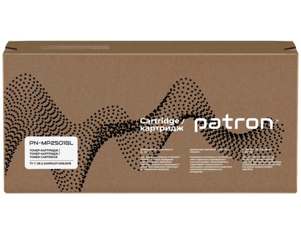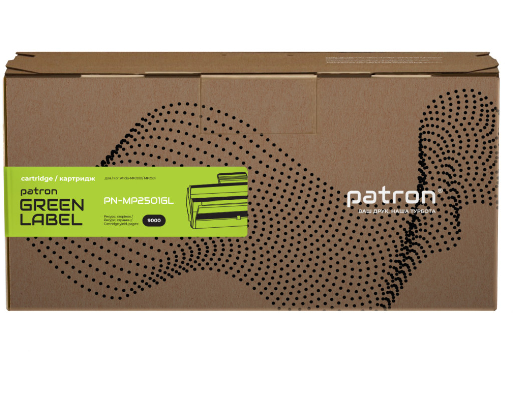 | Тонер-картридж сумісний Ricoh MP2501 Green Label Patron (PN-MP2501GL) оптимальне рішення для лазерних принтерів та БФП. Основні властивості Детальна інформація: Що таке сумісний картридж? Кожен користувач друкувальної техніки стикається з питанням купівлі нового картриджа і знаходить досить велику кількість пропозицій. Як зробити правильний вибір? Розглянемо основні варіанти: Виробники друкувальних пристроїв (т.з. OEM виробники) наполягають на використанні оригінальних картриджів. Їх основний недолік - висока вартість. Сумісні картриджі виробляються різними компаніями - сторонніми виробниками. Вони дають можливість істотно заощадити на друці, проте питання оптимального балансу між якістю друку, ціною, гарантією та ресурсом картриджа залишається вибором Покупця. Тонер-картридж сумісний Ricoh MP2501 Green Label Patron (PN-MP2501GL) гарантія Ми гарантуємо 12 місяців справної роботи картриджа та проведемо заміну продукції з виробничим дефектом. Якість друку Картриджі серії Patron Green Label виготовляються з використанням нових корпусів та повністю придатні для повторної заправки. Основна відміна серії Patron Green Label від картриджів низького цінового сегменту – якість комплектуючих, що забезпечує високу оптичну щільність друку, а також ресурс, аналогічний оригінальному картриджу. При виробництві картриджів Patron Green Label виробник дотримується загального стандарту ISO 9001:2015 і спеціальні стандарти, що використовуються в індустрії друку - ISO 19752:2017 для монохромних картриджів ISO 19798:2017 - для кольорових картриджів, а також STMC стандарт для контролю ресурсу. Захист навколишнього середовища Виробництво картриджів Patron Green Label відбувається з виконанням вимог міжнародного стандарту по захисту навколишнього середовища - ISO 14001:2015. Залишки матеріалів і комплектуючих, що використовуються для виробництва картриджів Patron Green Label, передаються на утилізацію відповідно Закону України "Про відходи". Для виробництва картонної упаковки ми використовуємо перероблені матеріали з нанесенням мінімальної кількості фарби. А конструкція коробки для картриджа дозволяє кілька разів відкривати і закривати його на "замок" для транспортування в сервісний центр. Ми закликаємо до нанесення мінімального впливу на довкілля. Тому заправляйте і відновлюйте картриджі Patron Green Label. Тонер-картридж сумісний Ricoh MP2501 Green Label Patron (PN-MP2501GL) економія на офісному друці Вартість картриджів серії Patron Green Label в середньому на 70-80% нижче оригінальних витратних матеріалів. Оптимальне співвідношення ціна-якість робить дану продукцію хорошим вибором для Клієнтів, що бажають заощадити на друці і не прогадати з якістю. Зовнішній вигляд Ми потурбувалися про те, щоб упаковка картриджа була не лише екологічною, функціональною, мала мінімально можливі фізичні розміри, але і містила усю необхідну інформацію. На зеленій етикетці знаходиться інформація про картридж, його сумісність з друкувальними пристроями, номер партії, дата виготовлення, контакти виробника, а також номер телефону безкоштовної гарячої лінії для українських споживачів. Сподіваємось, що наведена інформація дозволить Вам зробити правильний вибір. Ваш друк – наша турбота! Оптимальний варіант для користувача, що хоче заощадити;При виробництві картриджа використовується новий корпус;Гарантований ресурс;Економія 70-80% у порівнянні з оригінальними витратними матеріалам