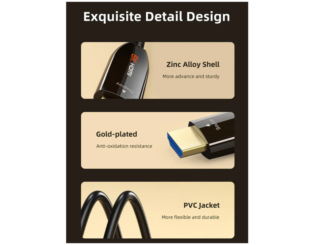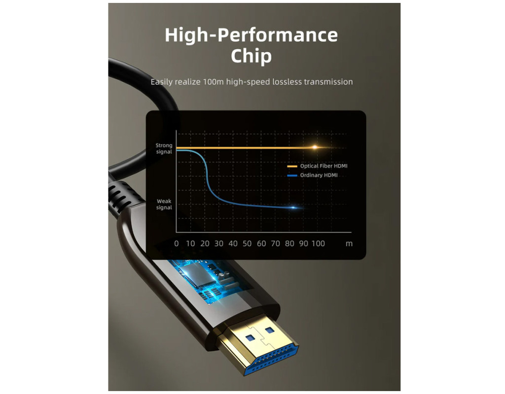 Кабель HDMI забезпечує найвищу швидкість передачі сигналу, що дозволяє передавати цифрове відео надвисокої чіткості та стереозвук. Активний оптичний кабель HDMI (AOC) призначений для забезпечення високошвидкісної передачі даних зі швидкістю 48 Гбіт/с без втрат на великих відстанях до 20 м. Цей кабель HDMI - ідеальний вибір для кришталево чистого відео та чудового звуку. HDMI 2.1 підтримує роздільну здатність 8K 60 Гц, HDR, ARC, HDCP2.2 і 3D візуальні ефекти. Високоякісні позолочені контакти 24K - для ідеальної передачі сигналу та захисту від корозії. Застосування: цифрове телебачення, світлодіодні вивіски, домашній кінотеатр, Blu-ray, 3D-відео, проектори, телевізійні приставки, відеореєстратори, ігрові консолі, комп'ютери, системи відеоспостереження та безпеки.