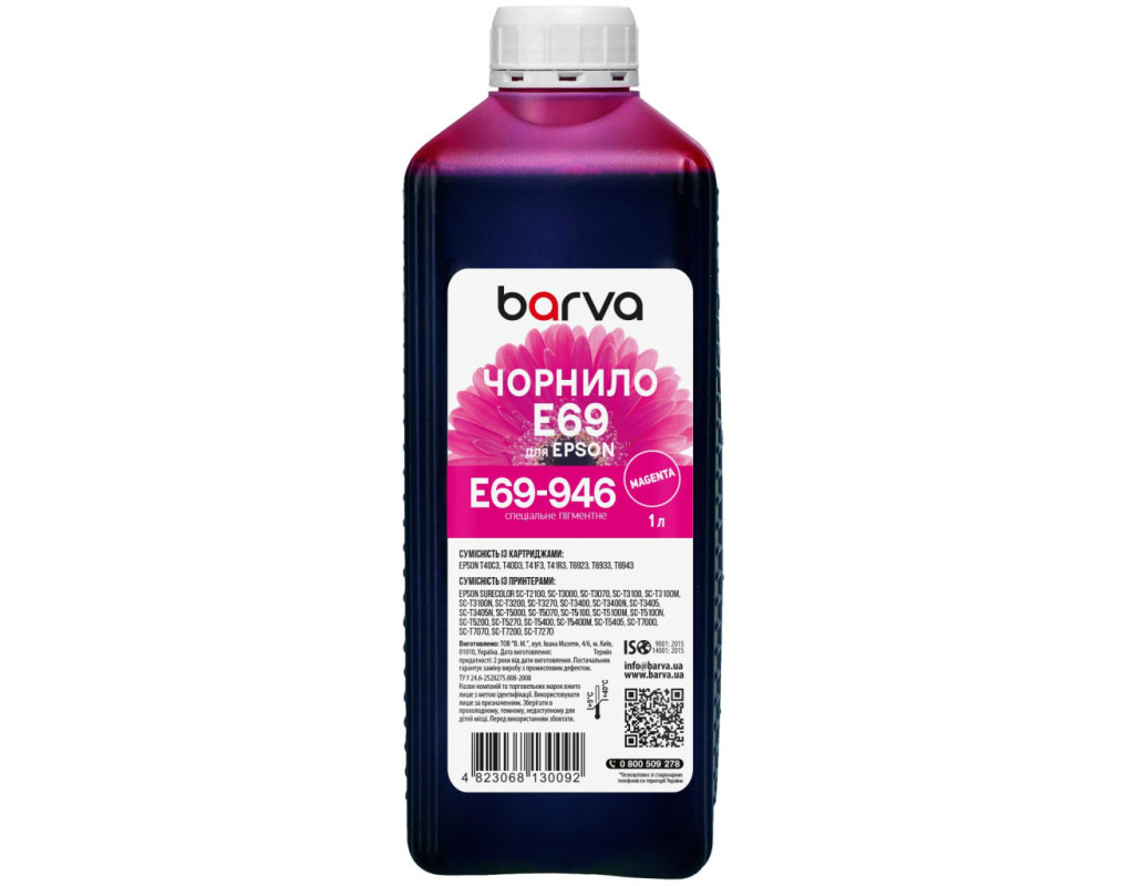 | Більшість з нас чули, що на відміну від лазерної техніки, яка формує зображення за допомогою тонера, струменева техніка використовує для друку спеціальні чорнила (краска для принтерів). Чорнило для Epson T6933 спеціальне 1 л, пігментне, пурпурове Barva (E69-946) використовується переважно для заправки ПЗК та СБПЧ. Чорнила E69-946 Barva мають офіційну гарантію від виробника – АТ000953. При виборі чорнила для принтерів Вам також необхідно звернути увагу на колір картриджа, який плануєте заправляти. Дані чорнила Barva мають колір – magenta (пурпурний). Виробник гарантує безперебійну роботу чорнил протягом всього терміну використання, який складає – 2 роки. Тип чорнил E69-946 Barva – Пігментні. Українська компанія ТОВ «В.М.» займається виробництвом чорнил під торговою маркою Barva вже багато років. На базі власної лабораторії відбувається як розробка нових формул, так і неперервний контроль якості продукції, що випускається. При виробництві чорнил виробник слідує стандартам ISO 9001:2015 та ISO 14001:2015. Чорнила Epson ТМ Barva повністю сумісні не тільки з чорнилами ТМ Patron, але й з чорнилами інших виробників. Для досягнення оптимального результату в передачі кольору та стійкості до світла ми рекомендуємо використовувати комбінацію – Фотопапір для струменевого друкуBarva + чорнила Barva. Дана фарба для принтера Barva має фасовку – 1 л: Фасовки 1 кг/1 л/18 кг будуть зручними для сервісних центрів або користувачів, які часто стикаються з необхідністю заправки картриджа або резервуарів друкуючих пристроїв.. Також рекомендуємо Вам звернути увагу на ще один варіант фасовки для сервісних центрів– Service-Pack. Ви можете купити Чорнило для Epson T6933 спеціальне 1 л, пігментне, пурпурове Barva (E69-946) в нашому інтернет-магазині з доставкою по Києву та всій Україні. |