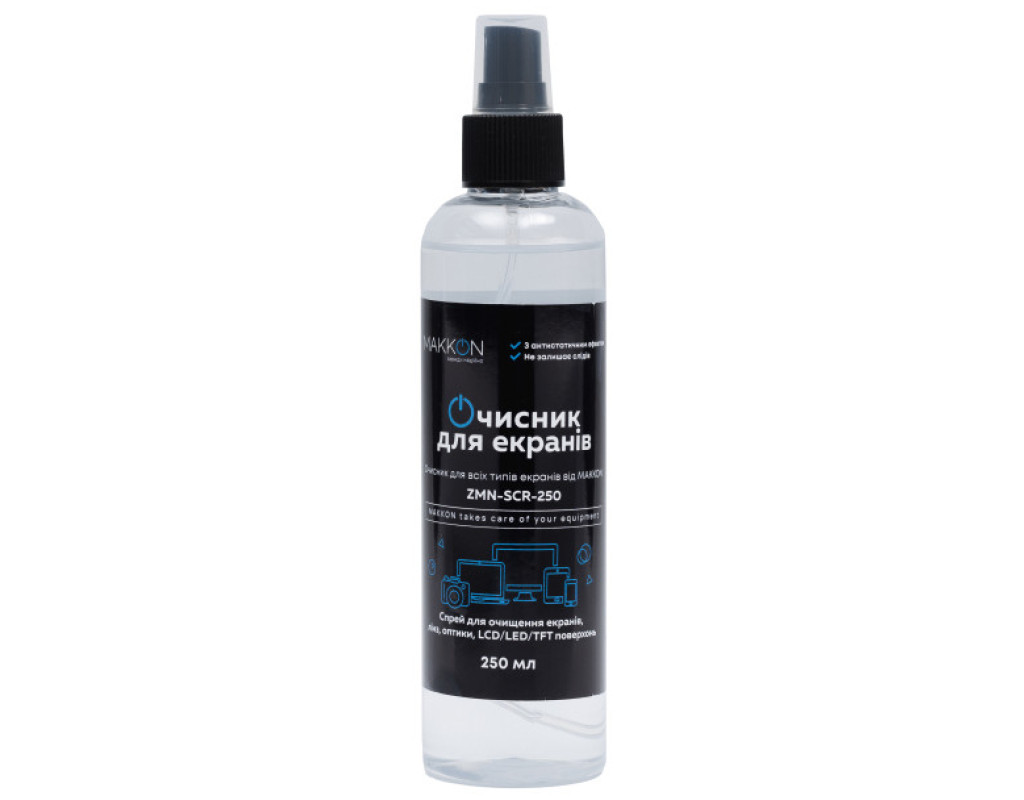 Очисник для всіх типів екранів MAKKON, 250 мл Опис: Очисник MAKKON — це універсальний спрей, який призначений для дбайливого очищення екранів усіх типів: TFT, LCD, LED, Plasma, а також моніторів, дисплеїв ноутбуків, смартфонів, екранних фільтрів і скляних поверхонь. Завдяки спеціально розробленій формулі, він ефективно видаляє пил, плями, відбитки пальців та інші забруднення, залишаючи поверхню бездоганно чистою. Переваги: