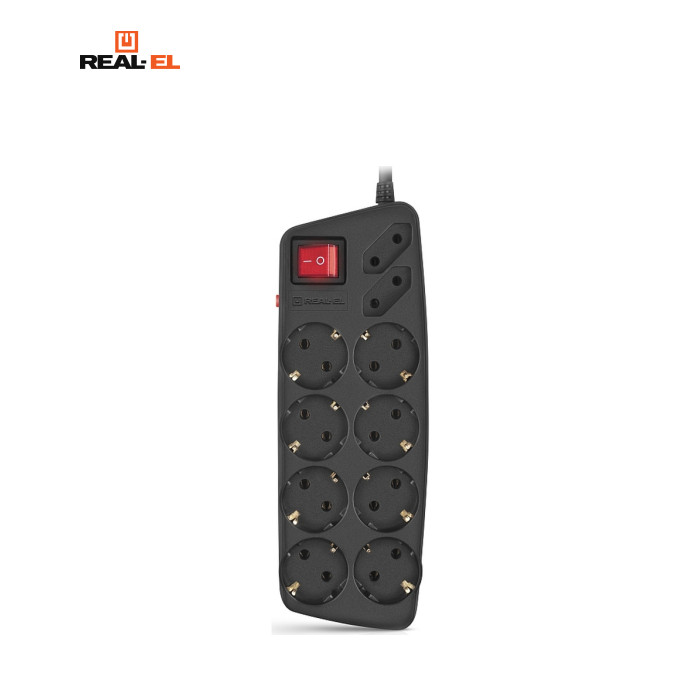 Сетевой фильтр-удлинитель REAL-EL RS-10 PROTECT – стиль, надежность и забота о вашем комфорте. Он сочетает современный дизайн с практической функциональностью, давая уверенность в каждом подключении. Корпус из термостойкого пластика, продуманная система защиты и качественный кабель гарантируют долговечность и безопасность. Фильтр позволяет подключить до десяти приборов одновременно: восемь розеток с заземлением и две дополнительные компактные плоские розетки обеспечивают универсальность использования. Удобная двухполюсная кнопка питания со световой индикацией позволяет легко управлять подключенными устройствами. Оснащенный многократным биметаллическим термопредохранителем, фильтр обеспечивает дополнительную защиту от перегрузок и перегрева. Для еще большего удобства предусмотрена возможность настенного крепления, экономящего пространство и придающего комфорт в использовании. REAL-EL RS-10 PROTECT – ваш надежный помощник по защите и питанию техники. Особенности