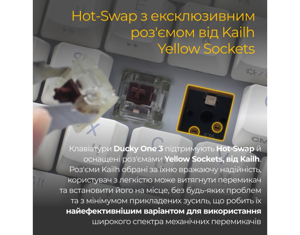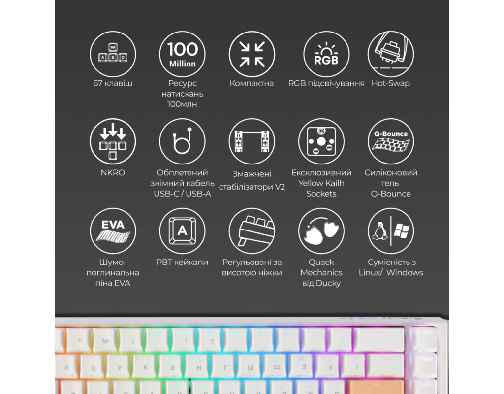 | Клавиатура Ducky One 3 SF Cherry MX Red RGB UA USB White (DKON2167ST-RUAPXPWWWSC1) — это стильный и функциональный инструмент для поклонников качества и эстетики. Она сочетает в себе механическую конструкцию с линейными переключателями Cherry MX Red, которые обеспечивают быстрый отклик без тактильной отдачи, что особенно важно для геймеров и пользователей, ценящих скорость клавиатуры. Особенностью этой клавиатуры является Hot-Swap технология с использованием Yellow Sockets от Kailh, которая предоставляет возможность замены переключателей без дополнительных усилий, обеспечивая широкие возможности для кастомизации под собственный стиль и потребности. Инновационный дизайн в стиле Ducky «QUACK» Mechanics объединяет стиль и функциональность, создавая неповторимый акустический опыт. Клавиатура имеет компактный формат, идеально подходящий для любого рабочего пространства, а долговечные PBT кейкапы с лазерной гравировкой обеспечивают устойчивость к истиранию. RGB подсветка позволяет полностью настроить яркость и цвета клавиш, а также сохраняет возможность программирования макросов для достижения максимального уровня персонализации. Благодаря NKRO технологии клавиатура точно распознает даже одновременное нажатие нескольких клавиш, что является незаменимым решением для игр и работы с большими объемами текста. Для удобства использования клавиатура поставляется с <б>съемным оплетённым USB-A/USB-C кабелемб> длиной 1.8 м, который гарантирует надежную совместимость с Linux и Windows. Комфорт во время эксплуатации обеспечивают смазанные стабилизаторы V2 и многослойная конструкция с Q-Bounce гелем и EVA шумопоглощающей пеной, которые создают тихий и приятный опыт набора текста. Клавиатура имеет два уровня настройки ножек для выбора оптимального угла наклона, что позволяет найти комфортный уровень для длительной работы. Комплектация клавиатуры стала еще более многофункциональной благодаря наличию пуллера для кейкапов и переключателей, инструкции по эксплуатации и дополнительного комплекта кейкапов для еще большей возможности персонализации. Ducky One 3 — это не просто устройство, а ваш персональный стиль в мире технологий. |