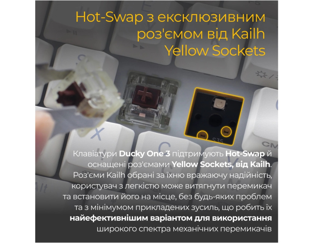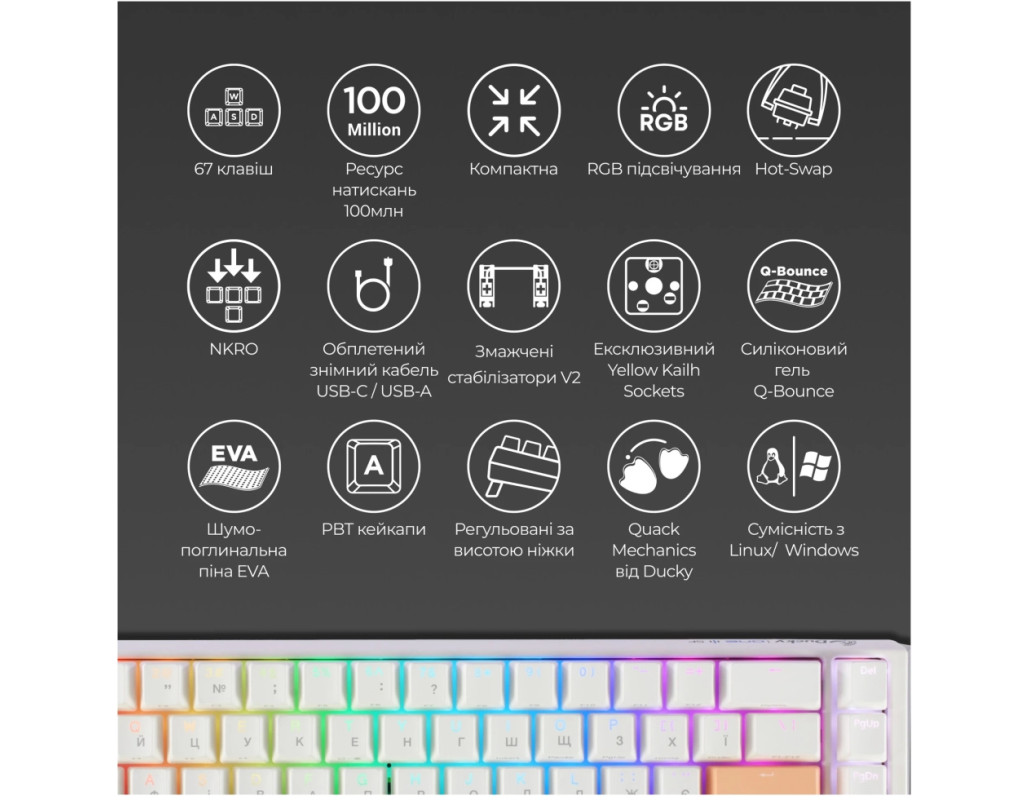 | Клавиатура Ducky One 3 SF Cherry MX Brown RGB UA USB White (DKON2167ST-BUAPXPWWWSC1) — это воплощение инноваций и стиля. Сочетая механическую конструкцию с технологиями последнего поколения, она создана для тех, кто ценит безупречное качество и функциональный дизайн в своей повседневной жизни. Ваше рабочее пространство превратится в зону креативности благодаря этой клавиатуре. Переключатели Cherry MX Brown гарантируют уникальные тактильные ощущения при наборе текста. Они обеспечивают тихий и плавный ход, что идеально подходит для интенсивной работы. Эти переключатели известны своей надежностью и долговечностью, а точная и чувствительная реакция на нажатие приносит истинное удовольствие от использования. Уникальная Hot-Swap технология с разъемами Yellow Sockets от Kailh позволяет заменять переключатели по вашему усмотрению. Никакой пайки — только легкая персонализация, открывающая безграничные возможности для творчества. Благодаря этому, клавиатура становится персональным инструментом, который соответствует вашим индивидуальным предпочтениям. Дизайн и материалы клавиатуры — это отдельная история. В соответствии с философией Ducky «QUACK» Mechanics, конструкция олицетворяет гармонию эстетики и функциональности. Кейкапы из качественного PBT пластика повышенной прочности противостоят истиранию даже при активной эксплуатации. Лазерная гравировка украинских и английских букв обеспечивает отличную четкость и долговечность. RGB подсветка — это яркая изюминка Ducky One 3 SF. Это не просто освещение, а целая палитра возможностей для персонализации. Программируемые макросы позволяют создавать уникальные световые эффекты, которые подчеркнут ваш индивидуальный стиль и отразят настроение. Клавиатура оснащена NKRO технологией (No Key Rollover), цель которой — безупречное распознавание нескольких нажатий одновременно. Это важно для геймеров и профессионалов, которые ценят скорость и точность. Съемный кабель USB-A/USB-C длиной 1.8 метров в тканевой оплетке делает подключение удобным и долговечным. Два уровня регулируемых ножек обеспечивают оптимальный угол наклона, что повышает комфорт даже при длительном использовании. Комплектация включает пуллер для снятия кейкапов и переключателей, инструкцию по эксплуатации и набор дополнительных кейкапов для кастомизации. Ducky One 3 SF — это больше, чем клавиатура. Это ваш верный помощник в творчестве, гейминге или профессиональной деятельности. Она добавляет стиль и функциональность, подчеркивая ваше стремление к исключительным решениям. |