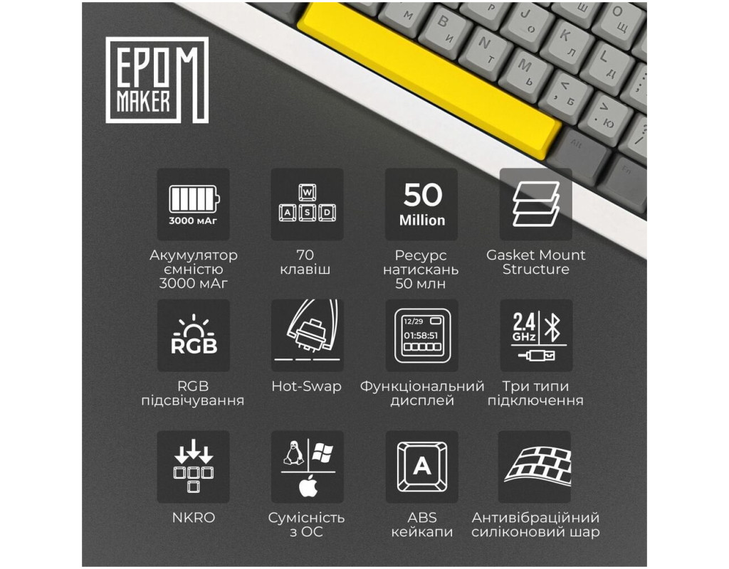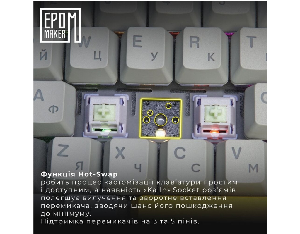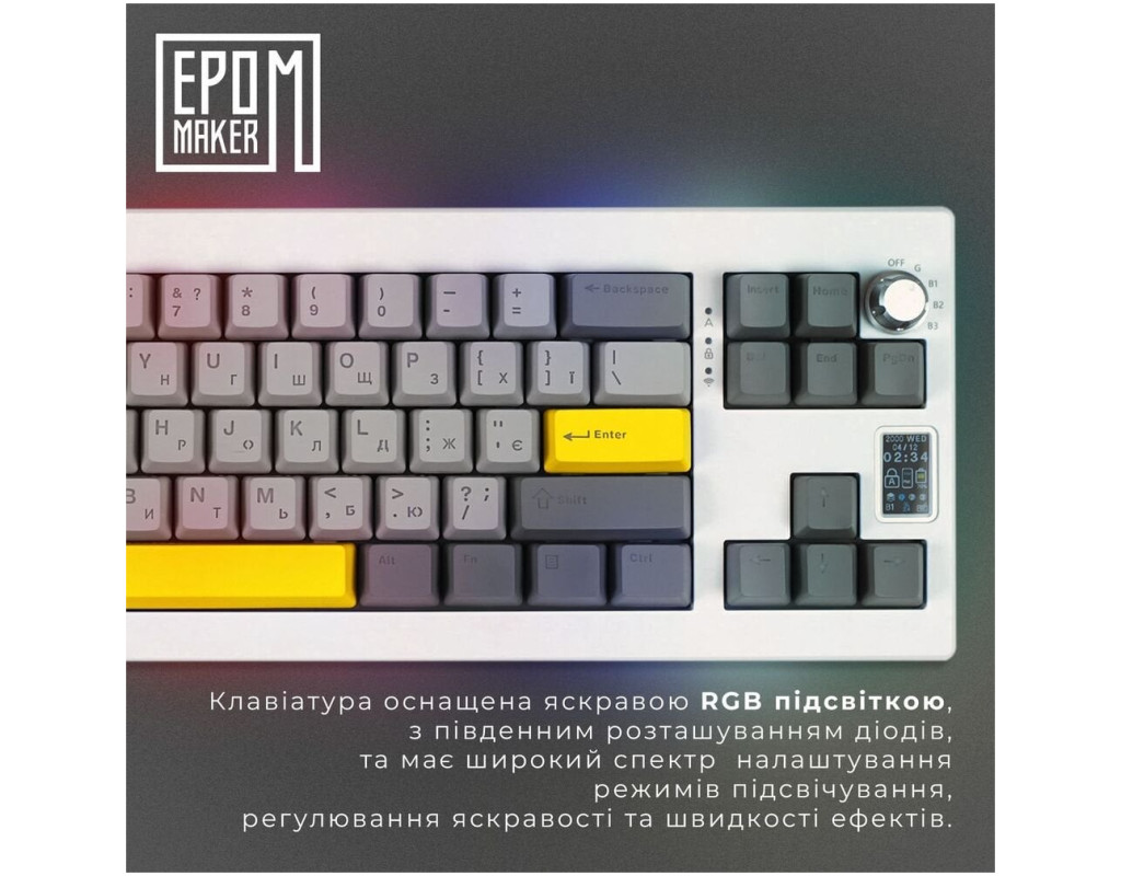 | Epomaker Shadow-X 70 Wisteria Linear Switch – это современная клавиатура, которая гармонично сочетает инновации, эргономику и стильный дизайн. Она создана специально для тех, кто ценит виртуозную точность исполнения и повышенную продуктивность в повседневной работе или развлечениях. Благодаря механической конструкции с уникальными переключателями Wisteria Linear Switch, эта клавиатура обеспечивает плавное, приятное на ощупь нажатие, исключающее ощущение фиксированных точек. Особенностью Epomaker Shadow-X 70 является технология Hot-Swap, позволяющая менять переключатели без использования пайки или профессионального оборудования. Это открывает широкие возможности для индивидуальной настройки, позволяя адаптировать клавиатуру именно под ваши потребности. RGB-подсветка клавиатуры добавляет ей особенного шарма, позволяя пользователям создавать неповторимую атмосферу благодаря индивидуальным световым эффектам. Клавиатура оснащена подсвеченными символами украинской и английской раскладки, что гарантирует удобство в использовании и адаптацию к любой ситуации. Дополнительное удобство обеспечивает универсальность подключения: беспроводное через 2.4 ГГц USB адаптер, Bluetooth или проводное через USB, которые позволяют использовать устройство на операционных системах Mac OS, Windows и Linux. Интегрированный LCD-экран обеспечивает контроль и настройку важных параметров, не отвлекая вас от работы или игры. Epomaker Shadow-X 70 также оснащена уникальной конструкцией Gasket Mount, которая гарантирует идеальное нажатие и минимизирует нежелательные шумы. Эта структура включает многослойные материалы и антивибрационный силиконовый слой, что делает клавиатуру отличным выбором для сред, где важны тишина и комфорт. Среди других особенностей стоит отметить сменные клавиши и колесо прокрутки, которые позволяют ещё больше адаптировать клавиатуру под ваши личные потребности. Это решение станет оптимальным выбором для геймеров, программистов и всей аудитории, которая ценит качественное, стильное и функциональное оборудование. Клавиатура Epomaker Shadow-X 70 Wisteria Linear Switch – это не просто устройство, а союзник в достижении максимальных результатов, который обеспечит комфорт в каждом нажатии. |