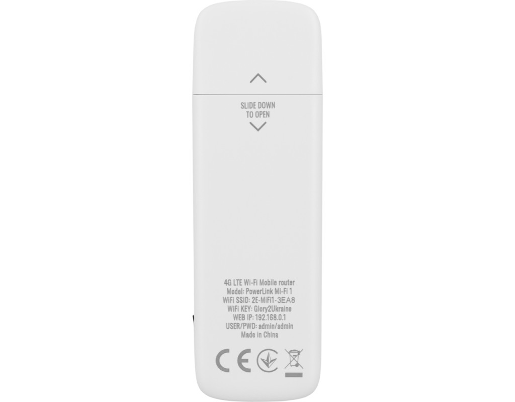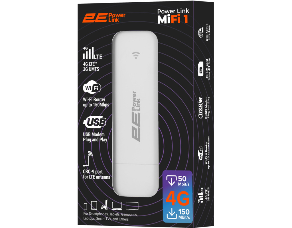 | 2E PowerLink MiFi 1: Универсальный 4G LTE Wi-Fi роутер для работы, путешествий и M2M Если вам нужно компактное, удобное и производительное устройство для доступа к интернету, стоит обратить внимание на 2E PowerLink MiFi 1. Этот 4G роутер не только обеспечивает скоростной мобильный интернет, но и предлагает удобные функции для организации небольшой Wi-Fi сети для различных сценариев использования. Компактный дизайн и широкие возможности2E PowerLink MiFi 1 имеет форм-фактор USB Flash-карты и выполнен в легком пластиковом корпусе белого цвета. Благодаря компактным размерам (96.5 х 31.2 х 11.6 мм) и весу всего 26 граммов, его легко брать с собой куда угодно. Подключение за несколько секундДля использования роутера в качестве мобильного модема достаточно вставить 4G SIM-карту и подключить устройство к USB-порту ноутбука или ПК. 2E PowerLink MiFi 1 автоматически распознается ОС Windows как виртуальная сетевая карта (RNDIS) и подключается к сети без дополнительных настроек и без необходимости установки дополнительных драйверов или программ. Для использования роутера в качестве Wi-Fi маршрутизатора достаточно вставить 4G SIM-карту и подключить устройство в USB-гнездо к зарядному устройству с постоянным напряжением 5В (это может быть зарядное устройство смартфона, автомобильная зарядка или мобильная батарея Powerbank). Роутер поддерживает все частоты 3G/4G украинских операторов (Vodafone, Киевстар, Lifecell), поэтому вы сможете пользоваться интернетом в городе или отдаленной местности. Производительность и удобствоПроцессор: LTE-модем ASR1803S в сочетании с Wi-Fi чипом AIC8800DW обеспечивают стабильную и быструю работу даже при высоких нагрузках. Роутер поддерживает Wi-Fi 802.11 b/g/n на частоте 2.4 ГГц. К Wi-Fi точке доступа можно одновременно подключить до 10 устройств - смартфоны, планшеты, ноутбуки, умные датчики, камеры видеонаблюдения или smartTV. Питание: USB 2.0 Type A позволяет подключать роутер к Powerbank, автомобильному зарядному устройству или обычному USB адаптеру 5В/1А. Дополнительные функцииУдобный веб-интерфейс на украинском языке для дополнительных настройки устройства, просмотра статистики использования трафика, создания черного списка MAC-адресов и ограничения скорости. Функции безопасности: Шифрование WEP/WPA PSK/WPA2 PSK для защиты вашей сети. Отправка и получение SMS и телефонная книга. Индикация: LED-индикатор для отображения статуса работы. Разъем CRC-9 и внешней LTE антенныДля улучшения качества приема сигнала в местностях со слабым покрытием, 2E PowerLink MiFi 1 оснащен разъемом CRC-9 (male) для подключения внешних антенн. Внешняя LTE антенна не входит в комплект роутера PowerLink MiFi 1. Рекомендации относительно антенн:Выбирайте антенны, поддерживающие диапазоны FDD LTE B3/7/8/20 (1800/2600/900/800 МГц) и TDD LTE B38/40/41. Это могут быть всенаправленные или направленные антенны в зависимости от вашего расположения. Установите антенну на открытом пространстве (например, на балконе или крыше дома, или автомобиля) для лучшего сигнала. Подключите кабель антенны к разъему CRC-9 на роутере. Используйте кабель с разъемом CRC-9 с сопротивлением 50 Ом. Если вы используете направленную антенну - настройте направление антенны на базовую станцию мобильного оператора, используя, например, приложение CellMapper для Android устройств. Сценарии использования PowerLink MiFi 1