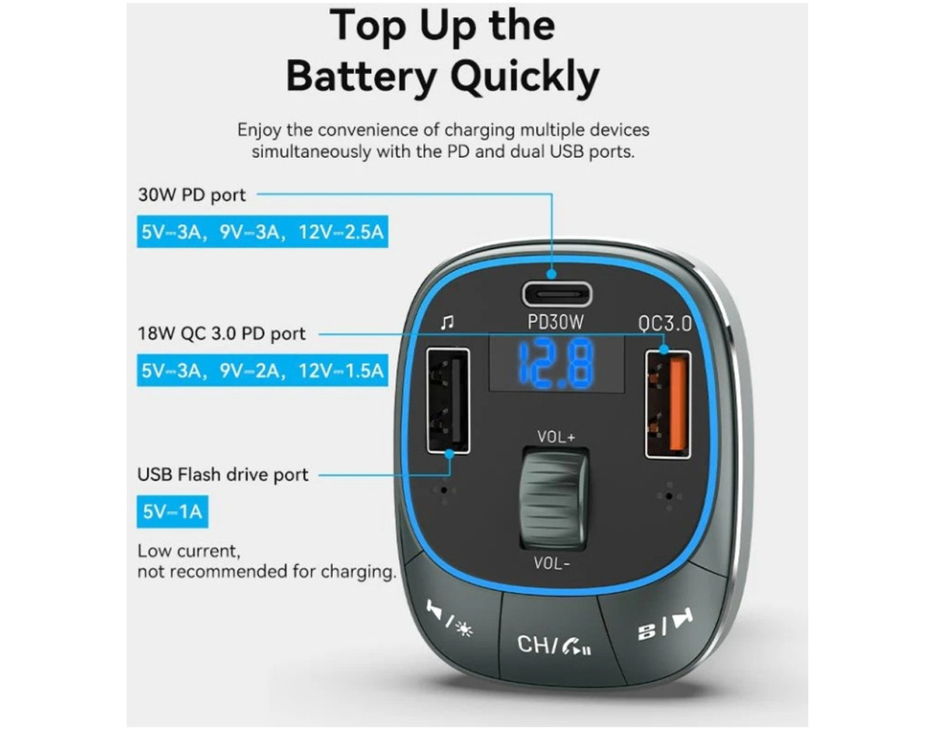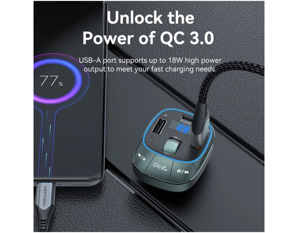 Автомобільний зарядний пристрій з FM-трансмітером Vention FFLB0 - це багатофункціональний пристрій, який не тільки швидко зарядить ваші USB пристрої в дорозі, але й забезпечить безперебійну передачу аудіо. Vention FFLB0 підтримує стандарт Bluetooth 5.0, який забезпечує стабільний сигнал і швидку реакцію на відстані до 10 метрів. Він оснащений трьома USB портами - двома USB-А портами та портом USB-С. Порти USB-С 30 Вт PD та USB-А1 QC 3.0 з потужністю до 18 Вт використовуються для швидкого зарядження підключених пристроїв, а порт USB-А2 дозволить прослуховувати улюблену музику з флеш-накопичувача об’ємом до 32 ГБ. Підключайте до FM-трансмітера Vention FFLB0 свій смартфон через Bluetooth та здійснюйте телефонні дзвінки у режимі Hands-Free, користуйтесь голосовою навігацією, слухайте улюблені аудіотреки. 7-колірне світлодіодне підсвічування полегшує підключення пристроїв та управління трансмітером у темну пору доби. Vention FFLB0 допоможе легко відстежувати стан напруги вашого автомобіля вдень і вночі. Він сумісний з моделями транспортних засобів 12-24 В. |