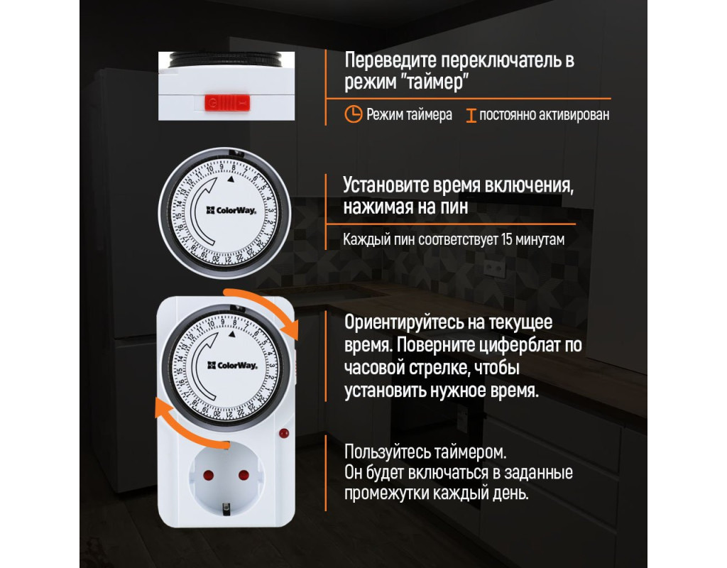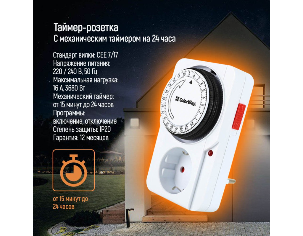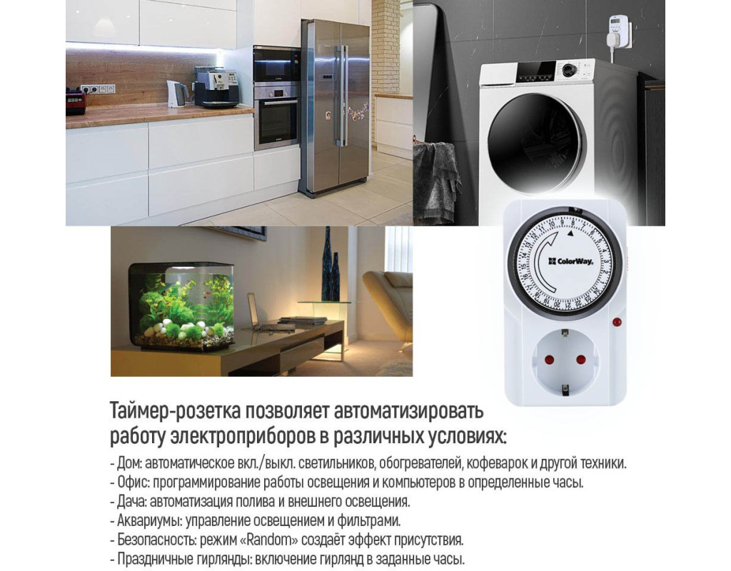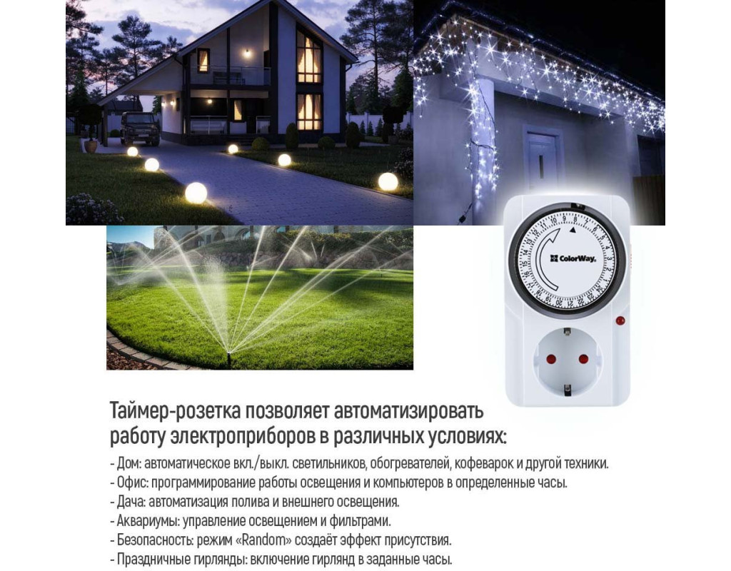 Розетка оснащена суточным таймером, который позволяет настроить включение и выключение устройств в течение 24 часов с шагом 15 минут. Программа повторяется ежедневно, без необходимости повторных настроек. Основное преимущество этой модели — компактный размер и удобство программирования. Настройте текущее время и желаемые интервалы, затем просто вставьте таймер в розетку. Ваше устройство будет автоматически включаться и выключаться в нужное время. Кроме того, розетка имеет переключатель для отключения функции таймера, что позволяет использовать её как обычную розетку. Таймер-розетка обеспечивает удобное управление энергопотреблением, способствуя экономии. Независимо от того, нужно ли вам включить свет в определенное время или выключить обогреватель перед сном, таймер выполнит эти задачи точно и своевременно, повышая комфорт и безопасность в вашем доме. Таймер-розетку можно использовать в различных ситуациях для автоматизации управления электрическими приборами. Несколько примеров: В доме: для автоматического включения и выключения бойлеров, обогревателей, вентиляторов, светильников, кофеварок или других бытовых приборов. В офисе: для управления освещением, компьютерной техникой, кондиционерами или другими приборами в определенные часы. На даче: для автоматизации системы полива, включения наружного освещения или других устройств во время вашего отсутствия. Для аквариумов: чтобы контролировать освещение и работу фильтров в определенные промежутки времени. Рождественские гирлянды: для автоматического включения праздничных огней на ёлке или фасаде дома в определённое время суток. Рекламные вывески: для автоматического включения рекламных или декоративных вывесок в определённое время. |
