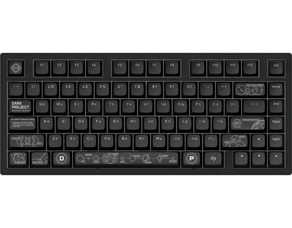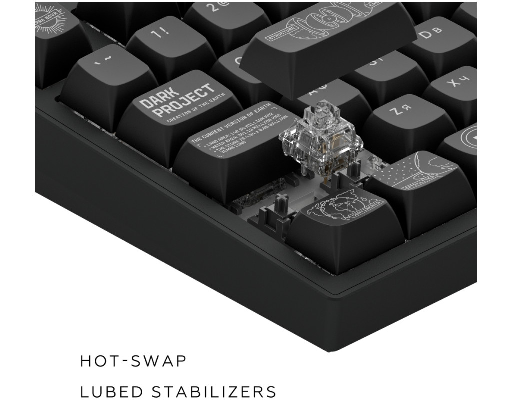 | Клавиатура Dark Project ALU81 Terra Nova PBT RGB Mech G3MS Moonstone Black — это блестящий пример высококачественных игровых устройств, которая подойдет даже самым требовательным игрокам. Она с легкостью превращает ваш игровой опыт в нечто невероятное благодаря сочетанию инновационных технологий и безупречного дизайна. Эта клавиатура имеет механическую конструкцию с уникальными переключателями G3MS Moonstone, которые объединяют в себе плавность и высокую отзывчивость. Встроенная возможность горячей замены переключателей позволяет настроить её под ваш индивидуальный стиль игры. Клавиатура оснащена яркой RGB подсветкой каждой клавиши, что позволяет создать атмосферу полного погружения во время игры, даже в темноте. Одним из главных преимуществ является беспроводное подключение через Bluetooth и USB адаптер 2.4 ГГц, которое обеспечивает свободу действий и надежное соединение без задержек. Это делает клавиатуру идеальным выбором для использования с телевизором, обеспечивая комфортное управление из любой точки дома. Корпус из сплава алюминия дарит устройству особую прочность, а неповторимые гравировки на обратной стороне добавляют загадочности. Кейкапы из PBT-материала имеют сублимационное окрашивание, изображая Солнечную систему и слои Земли, что превращает клавиатуру в произведение искусства. Благодаря звукопоглощающему креплению типа gasket mount, работа на клавиатуре становится тише, уменьшая звук при наборе и повышая комфорт пользователя. Компактный формат клавиатуры способствует сохранению пространства на рабочем месте. Интуитивно понятное программное обеспечение на веб-платформе, совместимое с QMK/VIA, позволяет легко настраивать клавиатуру в соответствии с вашими потребностями. Dark Project ALU81 Terra Nova — это идеальное сочетание доступности, качества и уникальности, которое на несколько шагов впереди среди конкурентов. |