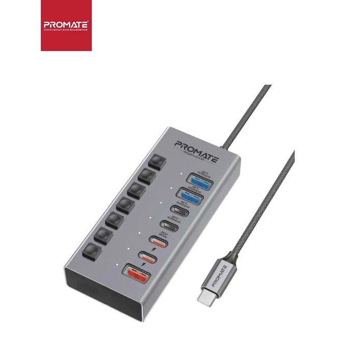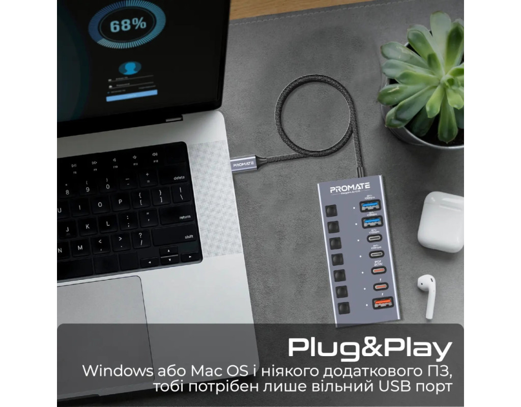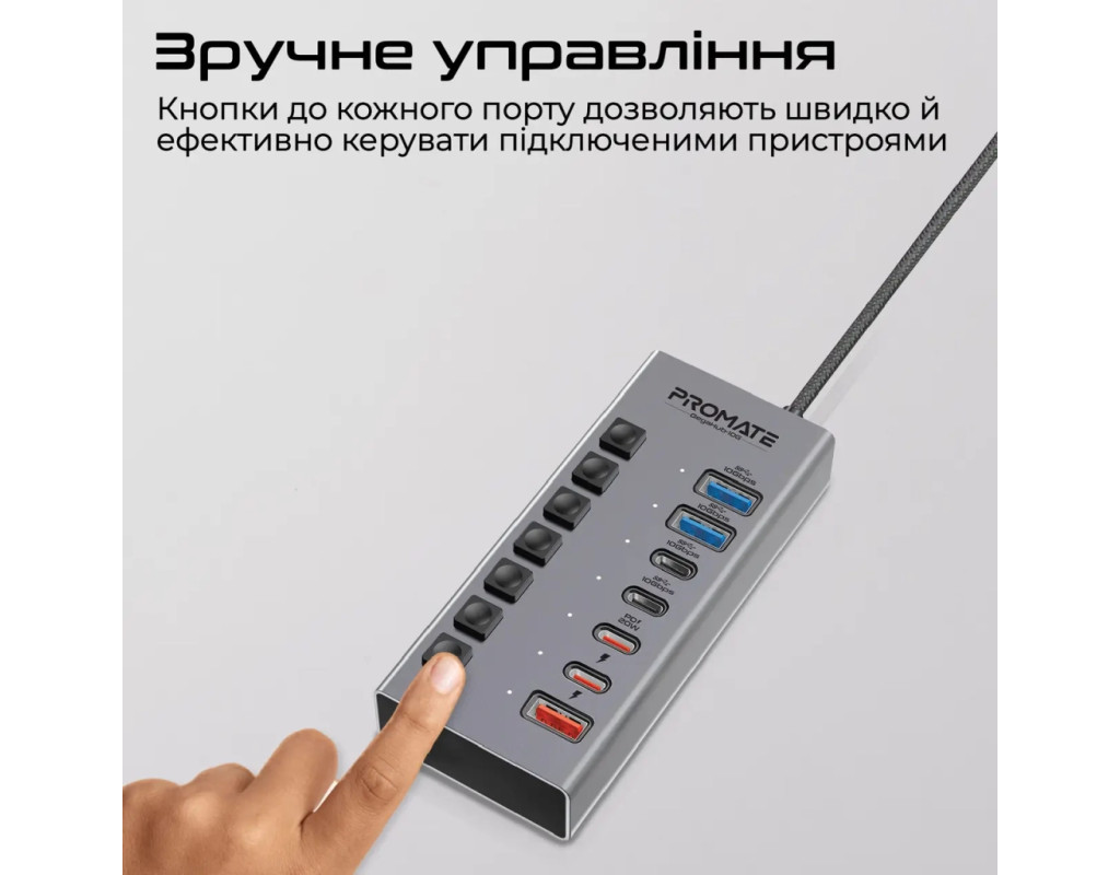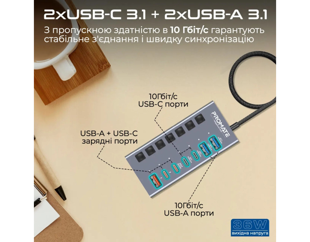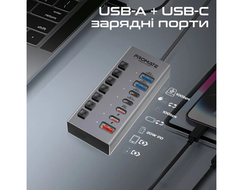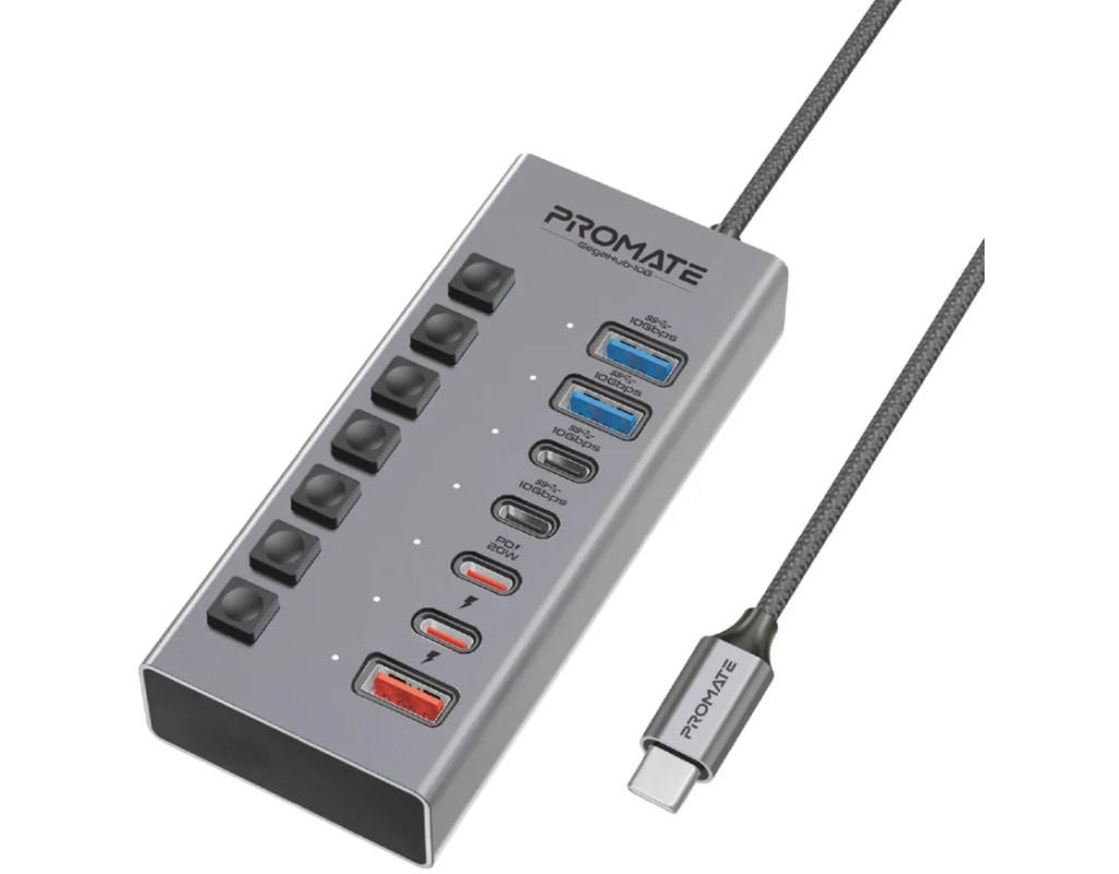 Promate Gegahub-10g – компактный и надежный USB-хаб. 7 портов, Power Delivery, 10 Гбит/с, и все это в корпусе с анодированного алюминия. Особенности: - 2xUSB-C 3.1 + 2хUSB-A 3.1: С пропускной способностью в 10 Гбит/с гарантируют стабильное соединение и быструю синхронизацию.