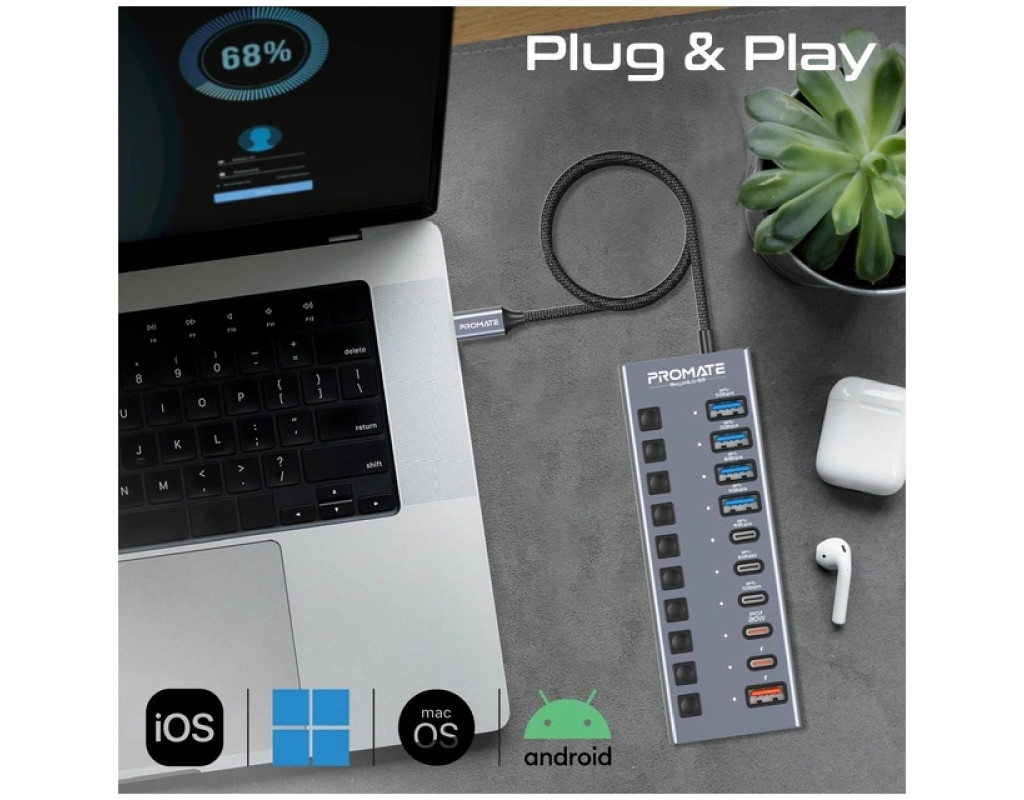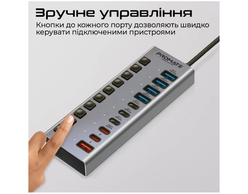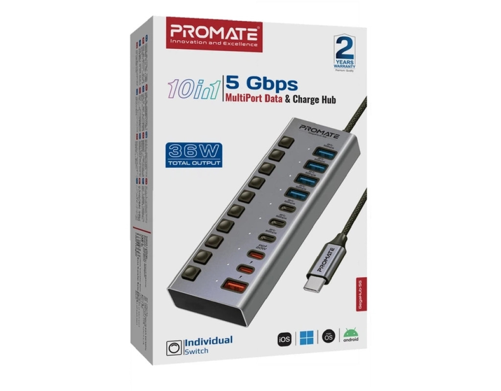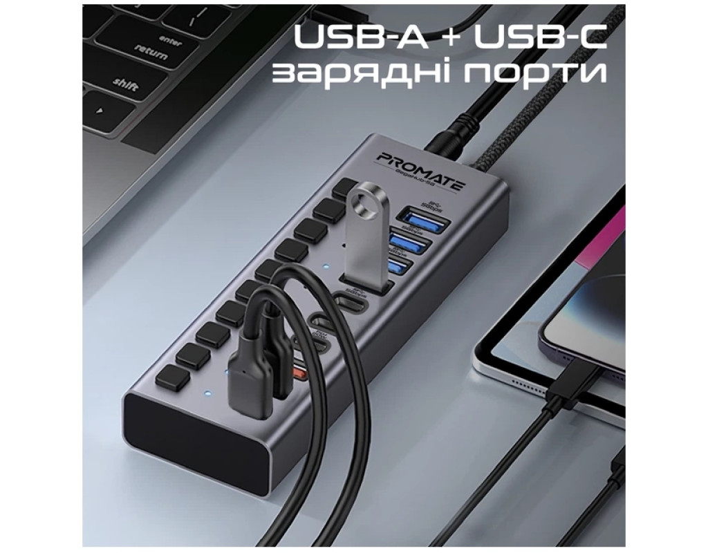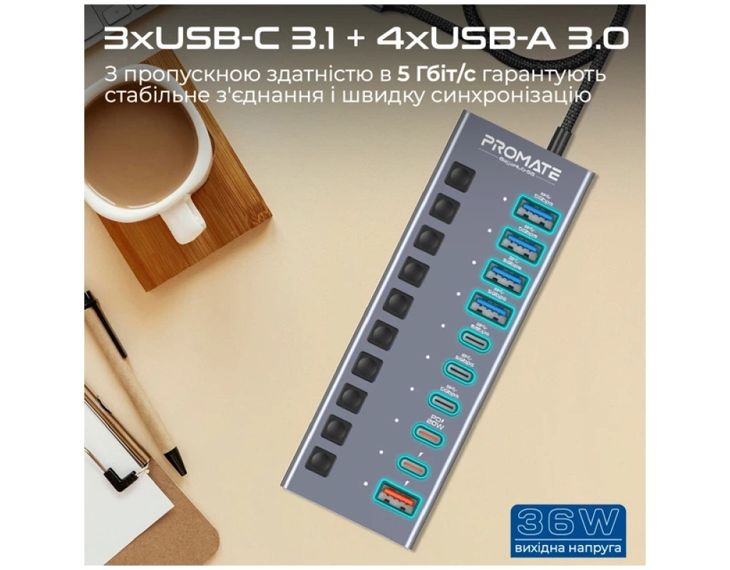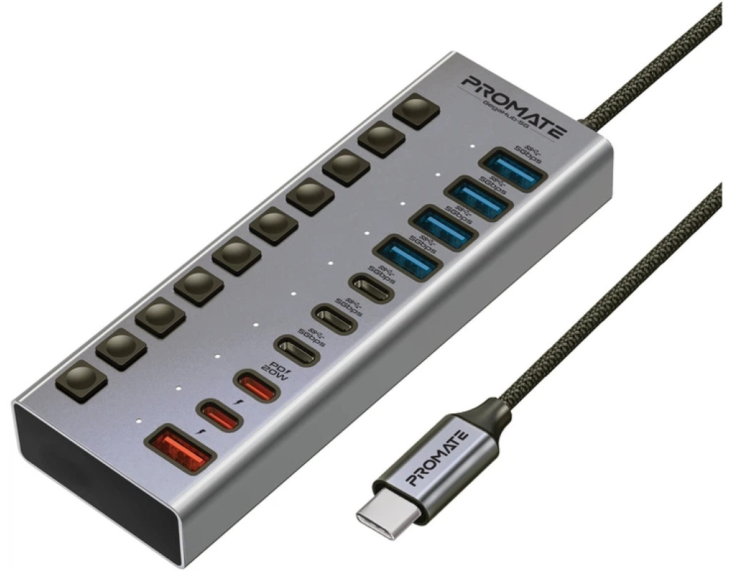Promate Gegahub-5g – компактный и надежный USB-хаб. • 3xUSB-C 3.1 + 4хUSB-A 3.0: С пропускной способностью в 5 Гбит/с гарантируют стабильное соединение и быструю синхронизацию • USB Type-C PD: Благодаря технологии Power Delivery, хаб способен принимать и передавать питание от источника на мощности до 20 Вт • USB-A + USB-C зарядные порты: Идеально подходят для питания подключенных периферийных устройств (5В/1.5A) • Удобное управление: Кнопки к каждому порту позволяют быстро и эффективно управлять подключенными устройствами • Безопасный: Встроенный чип Smart IC защищает Gegahub-5g и подключенные к нему устройства от перегрева, скачков напряжения, короткого замыкания и чрезмерной зарядки • Качественные материалы: Легкий и надежный USB-хаб из анодированного алюминия с антискользящими накладками из софт-тач резины, не перегревается и обладает большим запасом прочности • Plug&Play: Windows или Mac OS и никакого дополнительного ПО, тебе нужен только свободный USB порт Технические характеристики: • Входящее напряжение: DC 12В/3A • Входящее напряжение кабеля: AC 100В-240В/0.85A 50/60 Гц • Выходящее напряжение кабеля: DC 12В/3A (36 Вт) • 3xUSB-С 3.1 порты: 5 Гбит/с, 5В/0.5A • 4хUSB-А 3.0 порты: 5 Гбит/с, 5В/0.5A • USB Type-C PD порт: 5В/3A, 9В/2.22A, 12В/1.67A (20 Вт PD) • USB-A порт: 5В/1.5A • USB-C порт: 5В/1.5A • Материал: Анодированный алюминий, софт-тач резина • Размеры ШхВхГ: 50x150x20 мм • Длина встроенного кабеля: 80 см • Вес: 149 г Комплектация: • Хаб со встроенным USB-C кабелем • Адаптер для подключения хаба • Универсальный переходник на все типы розеток • Инструкция по эксплуатации Примечание: Хаб работает только при подключении комплектного блока питания. |
