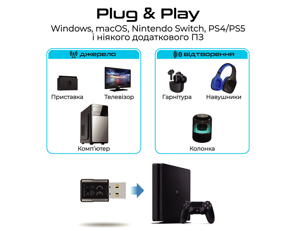 Особенности: - Bluetooth 5.0: Всегда стабильный и качественный сигнал без прерываний и отставаний звука в потоковых видео на расстоянии до 20 м - Multipoint: Подключай 2 устройства воспроизведения звука к одному источнику - Переходник USB-A to USB-C: Используй с консолью или стационарным ПК благодаря адаптеру, который идет в комплекте - Компактный размер: С габаритами 15х7х32 мм, занимает минимум места и не мешает другим устройствам, подключенным в соседние порты - Plug & Play: Windows, MacOS, Nintendo Switch, PS4/PS5 и никакого дополнительного ПО, тебе нужен только свободный USB-A или USB-C порт |