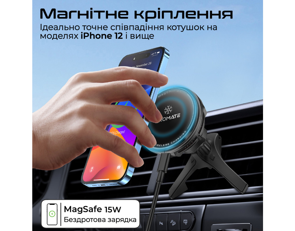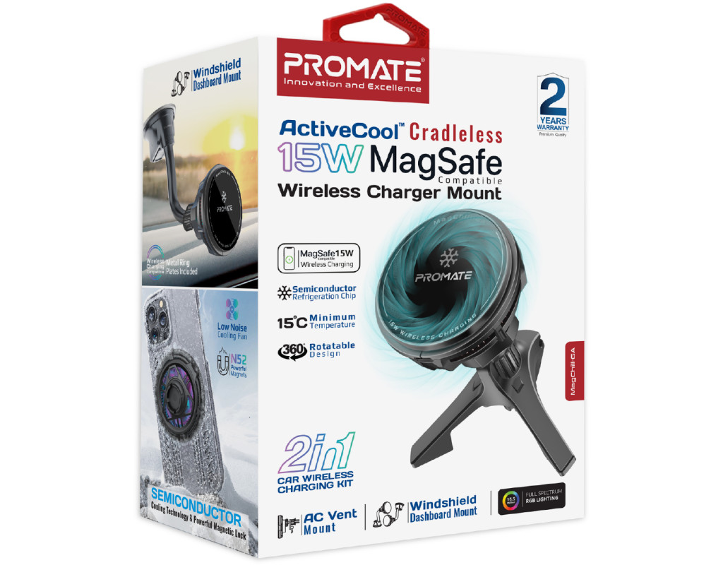 | MagChill-Ga – автомобильный держатель MagSafe от Promate с функцией охлаждения устройства во время зарядки. Крепление на дефлекторе с упорами обеспечивает максимальную устойчивость смартфона.