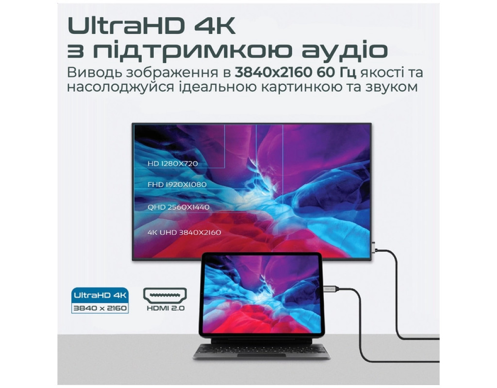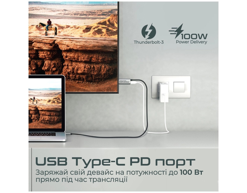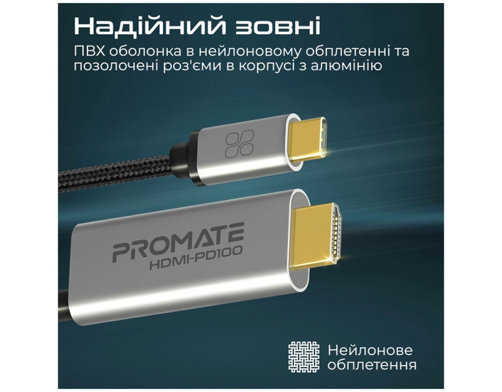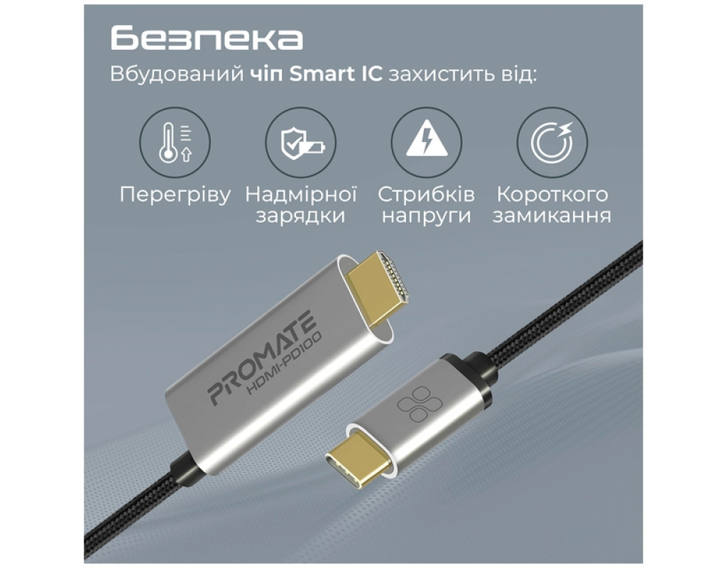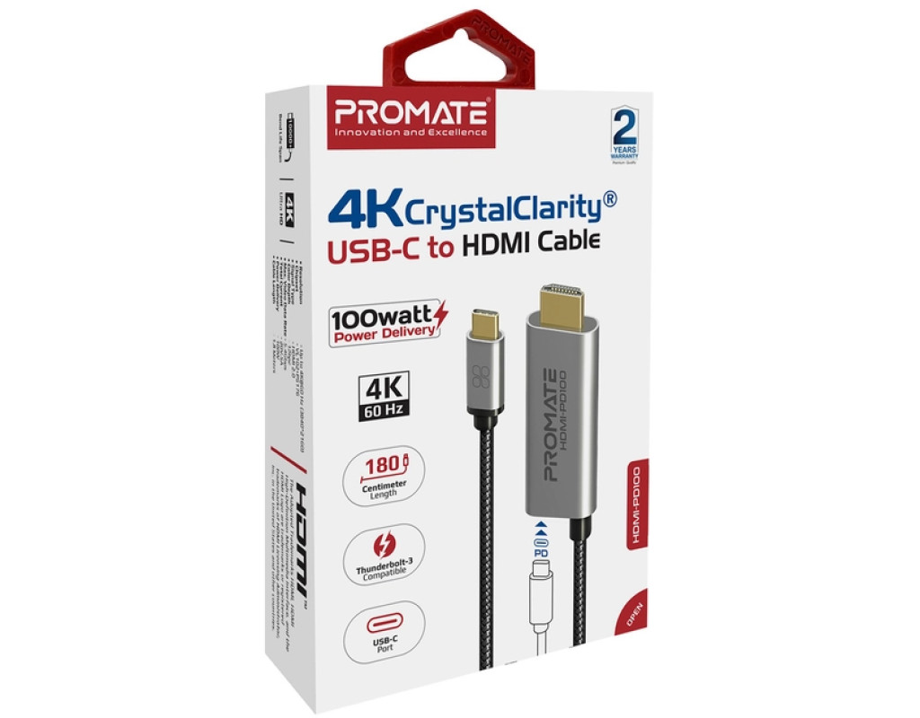 HDMI-PD100 - флагманский кабель от Promate с поддержкой 100 Вт Power Delivery и ThunderboltTM3. Позволяет одновременно заряжать твой девайс и транслировать видеопоток с USB-C устройства на внешний HDMI дисплей в UHD качестве. Особенности: - UltraHD 4K с поддержкой аудио: Выводи изображение в разрешении 3840x2160 60 Гц и наслаждайся идеальной картинкой и звуком.
