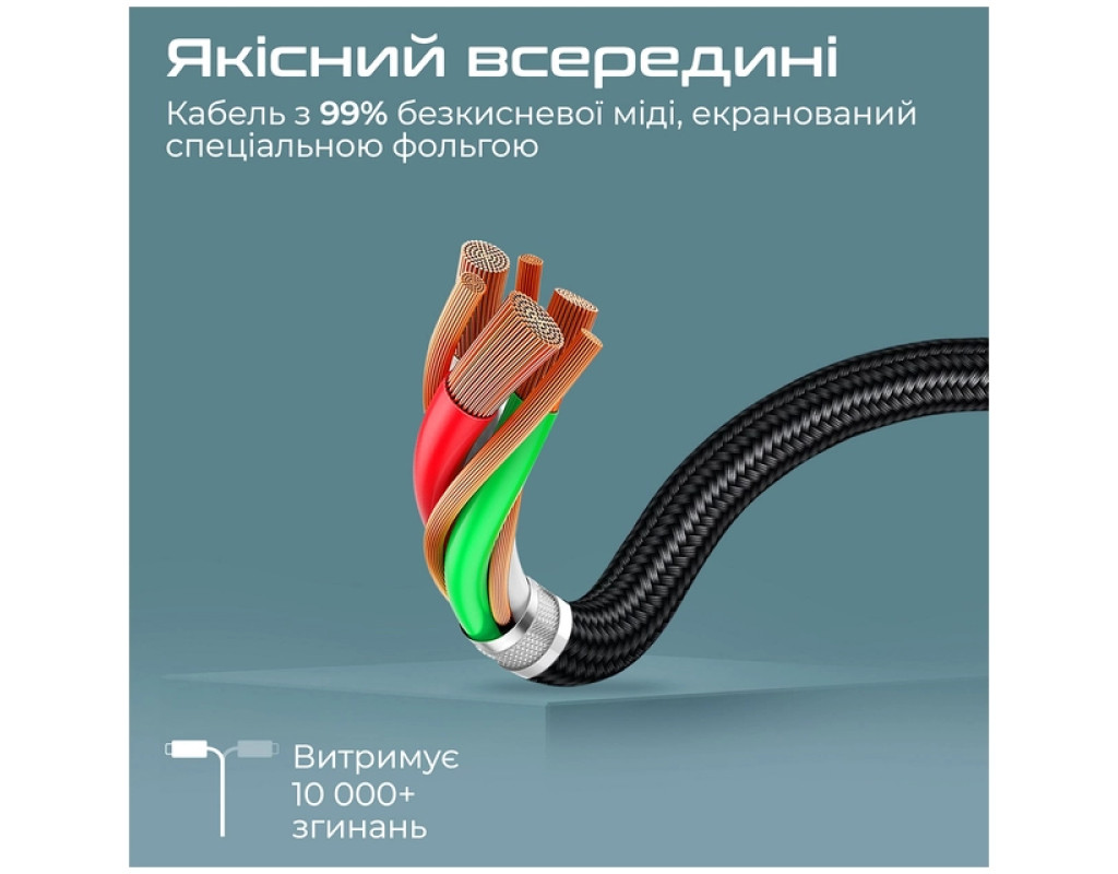 - Надежный снаружи: Износостойкая ПВХ оболочка в нейлоновой оплетке и протекторы возле коннекторов выдерживают более 10 000 сгибаний.
