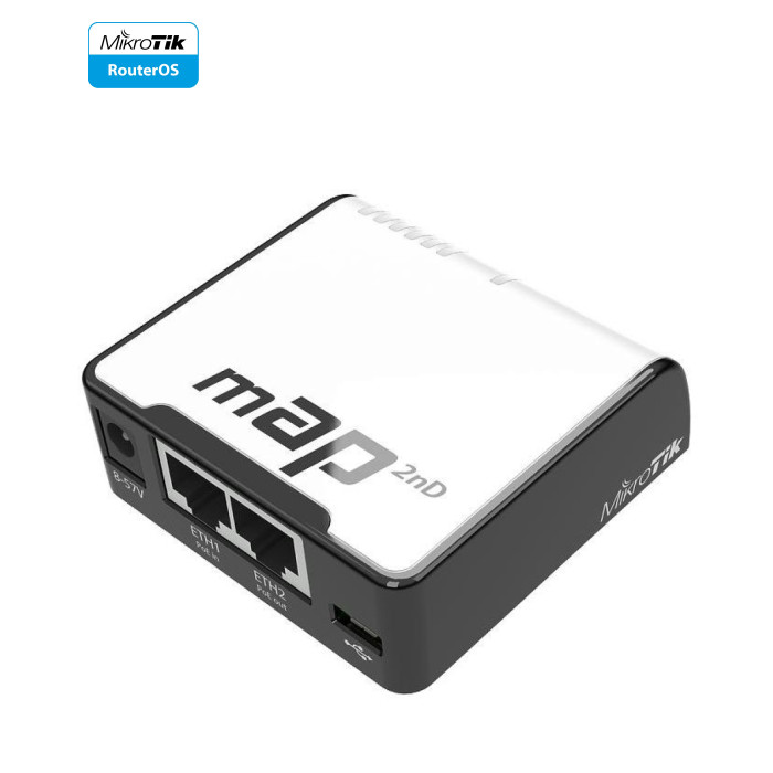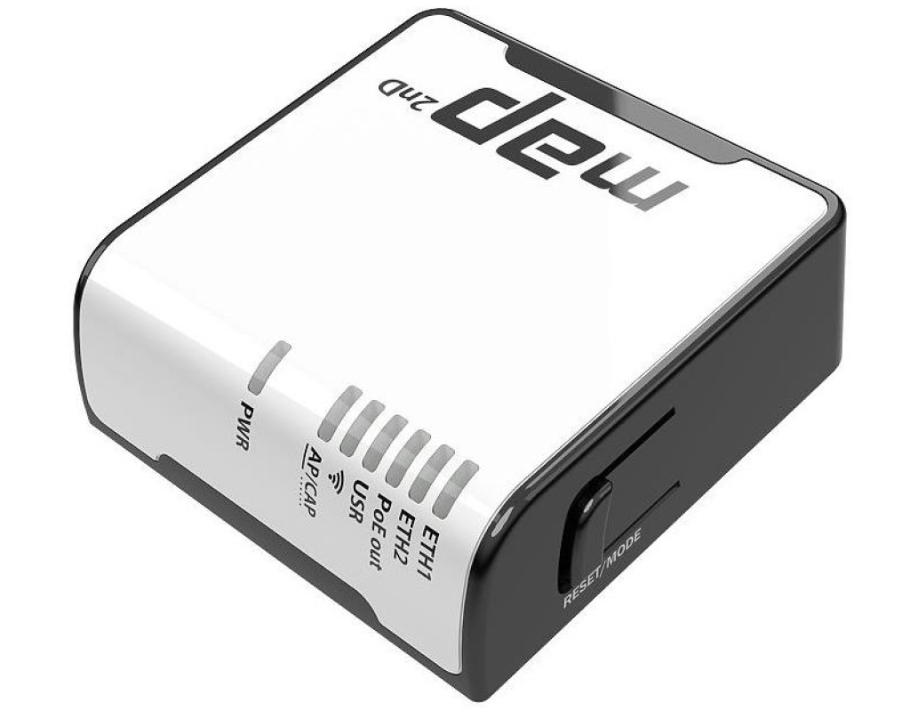 Маршрутизатор MikroTik mAP (RBmAP2nD) является беспроводной точкой доступа очень маленького размера, но с полными возможностями RouterOS. Устройство работает на частоте 2.4 ГГц, очень портативное и может питаться от самых разнообразных источников — USB, Passive PoE, от сети. Маршрутизатор также работает в качестве инжектора PoE — второй порт Ethernet обеспечивает до 500 мА на другое устройство, например, вы можете подключить к нему SXT CPE. Особенности: