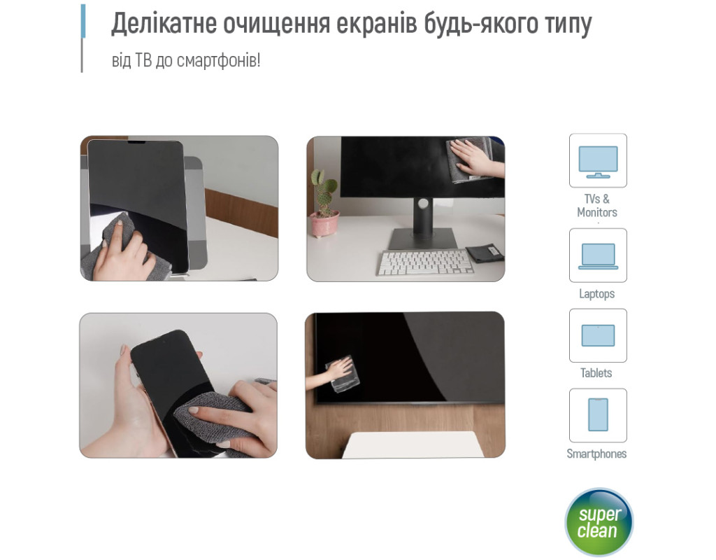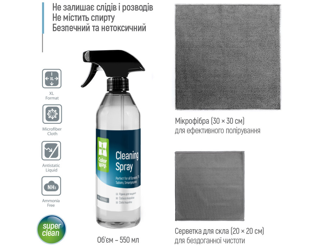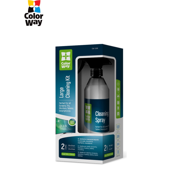 Чистящий набор ColorWay для деликатной очистки всех типов экранов: ТВ, мониторов, планшетов, ноутбуков и смартфонов. Очищает пыль и жир на различных электронных устройствах, не оставляя разводов, остатков, ворсинок и статического электричества. Нетоксичная и безопасная жидкость – не содержит спирта, аммиака и запаха, что делает её абсолютно безопасной для экранов различного типа, в том числе LCD, LED и OLED дисплеев, а также безопасной для детей, домашних животных и не вредит окружающей среде. Этот средство эффективно очищает, не оставляя царапин и разводов, что позволяет достичь идеального качества изображения без повреждения поверхностей. В комплекте также имеются две микрофибровые салфетки, которые деликатно очищают экраны и полируют их до блеска. Конструкция распылителя эффективно предотвращает протекание и случайное распыление. Два разных типа салфеток для более тщательной очистки.