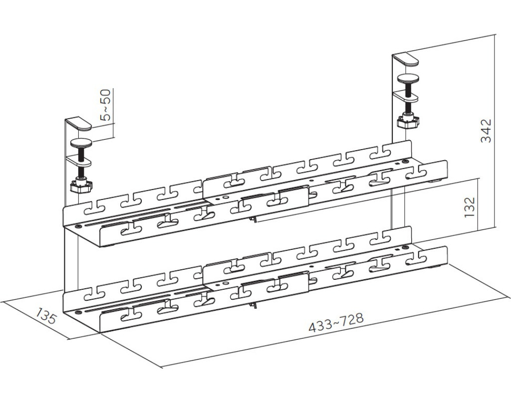 Две полки обеспечивают больше места для хранения. А конструкция с регулировкой ширины подходит для разных размеров столов и нужд в хранении. Легко устанавливается с помощью крепких зажимов и может вмещать кабели, хабы, удлинители и адаптеры питания. Ремешки для крепления входящих в комплект кабелей легко упорядочивают и закрепляют кабели, не создавая беспорядок на рабочем месте. |