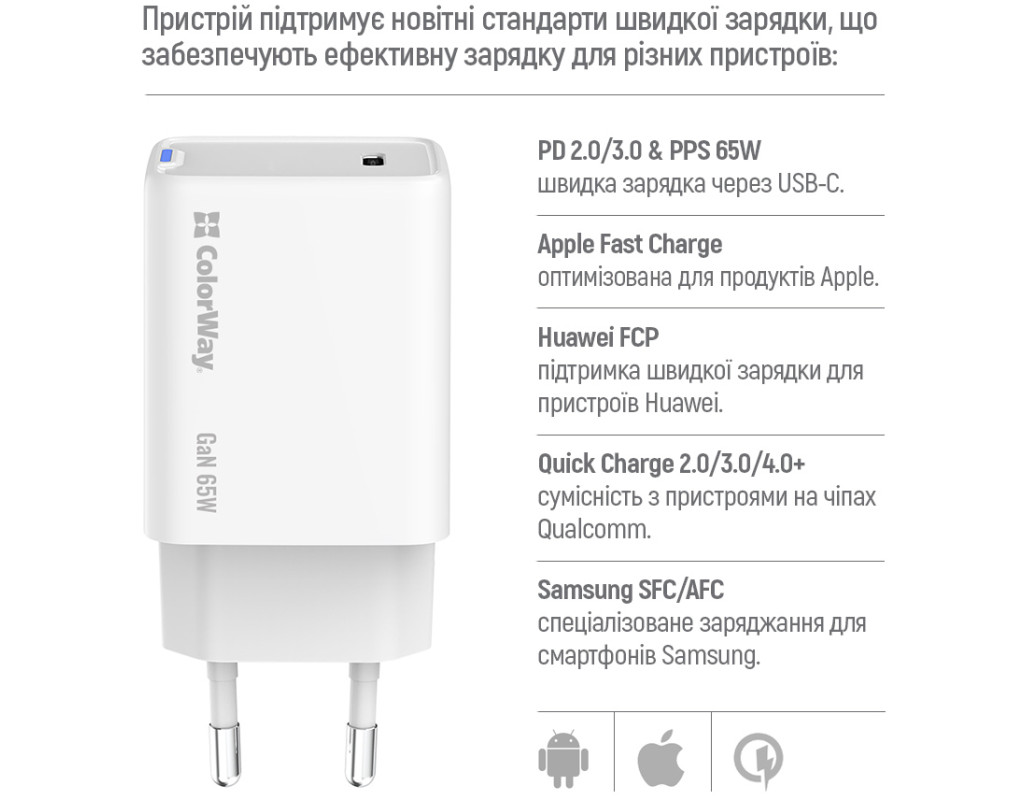| Зарядное устройство ColorWay GaN Mini 65W PD Port PPS USB-C white (CW-CHS049PD-WT) – это инновационный адаптер, который сочетает в себе передовые технологии и отличную функциональность, гарантируя быстрое и безопасное зарядное устройство для ваших электронных устройств. Благодаря максимальной выходной мощности в 65 Вт, он эффективно заряжает все гаджеты – от смартфонов и планшетов до ноутбуков и смарт-часов. Его универсальность позволяет использовать его также для фитнес-браслетов, экшн-камер и геймпадов, что делает этот адаптер незаменимым в повседневной жизни. Оснащенный GaN-технологией, устройство обеспечивает сниженное нагревание и улучшенную энергоэффективность, что значительно повышает его надежность и долговечность. Выполненный из высококачественного огнестойкого ABS-пластика, этот адаптер устойчив к механическим повреждениям, что гарантирует безопасность использования. Его интеллектуальная микросхема USB Auto ID автоматически оптимизирует процесс зарядки, определяя наилучшие параметры для каждого из ваших устройств. Этот адаптер поддерживает технологии быстрой зарядки, такие как Quick Charge 4.0, 3.0, Power Delivery 2.0 и 3.0, а также Programmable Power Supply (PPS). Это позволяет значительно сэкономить время на зарядке, обеспечивая устройствам максимальный выходной ток до 5 А через единственный USB Type-C порт. Так вы будете готовы к новым вызовам быстрее, чем когда-либо прежде. Благодаря своему компактному дизайну, ColorWay GaN Mini 65W легко поместится в вашей сумке или кармане, что делает его идеальным выбором для путешествий и повседневного использования. Это не просто зарядное устройство – это надежный помощник, который сочетает в себе качество, мощность и инновации, на которые вы всегда можете рассчитывать. |