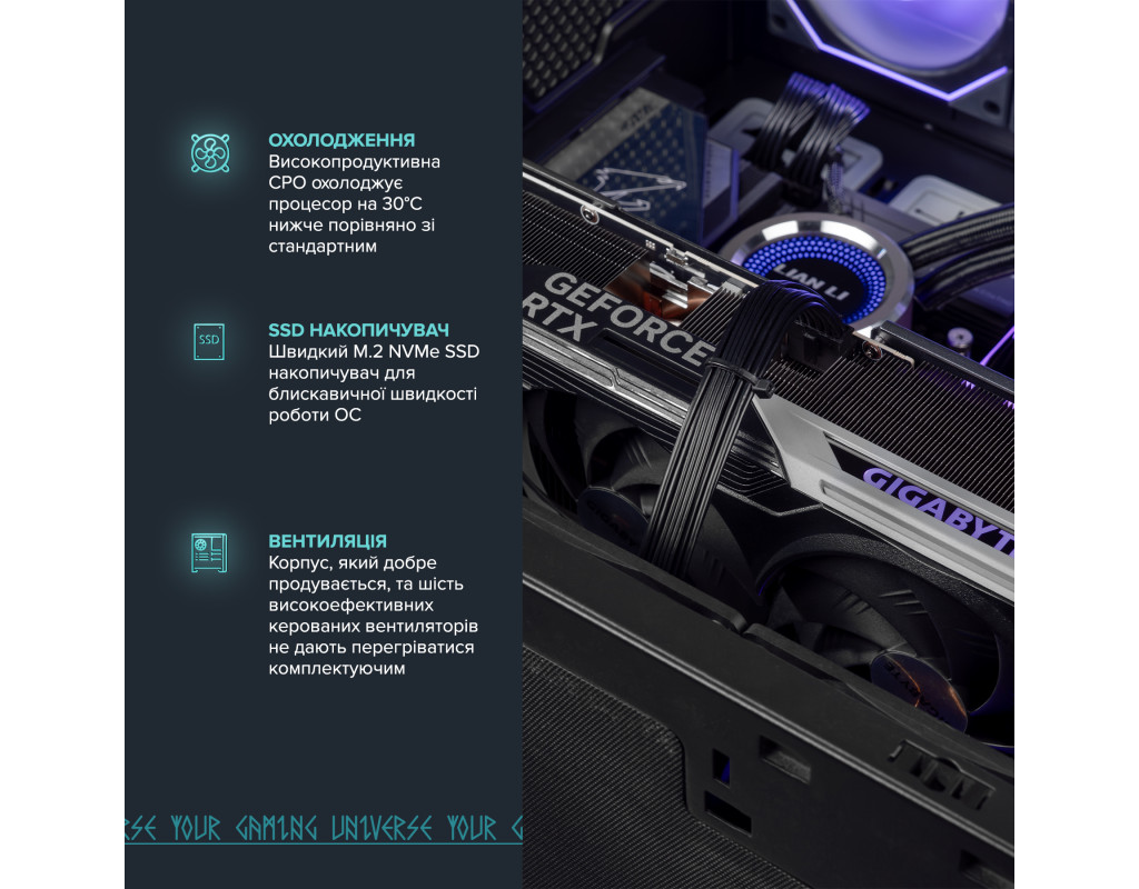 Геймер создает свое персонализированное, игровое пространство, где каждая деталь имеет особое значение. Печать ваших любимых героев на корпусе, комплектующие лучших производителей мира, множество вариантов подсветки – все это создаст невероятную атмосферу и еще больше погрузит вас в мир игры.