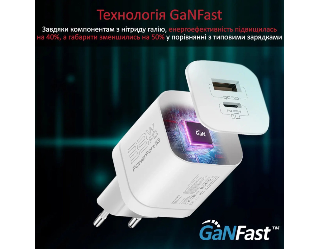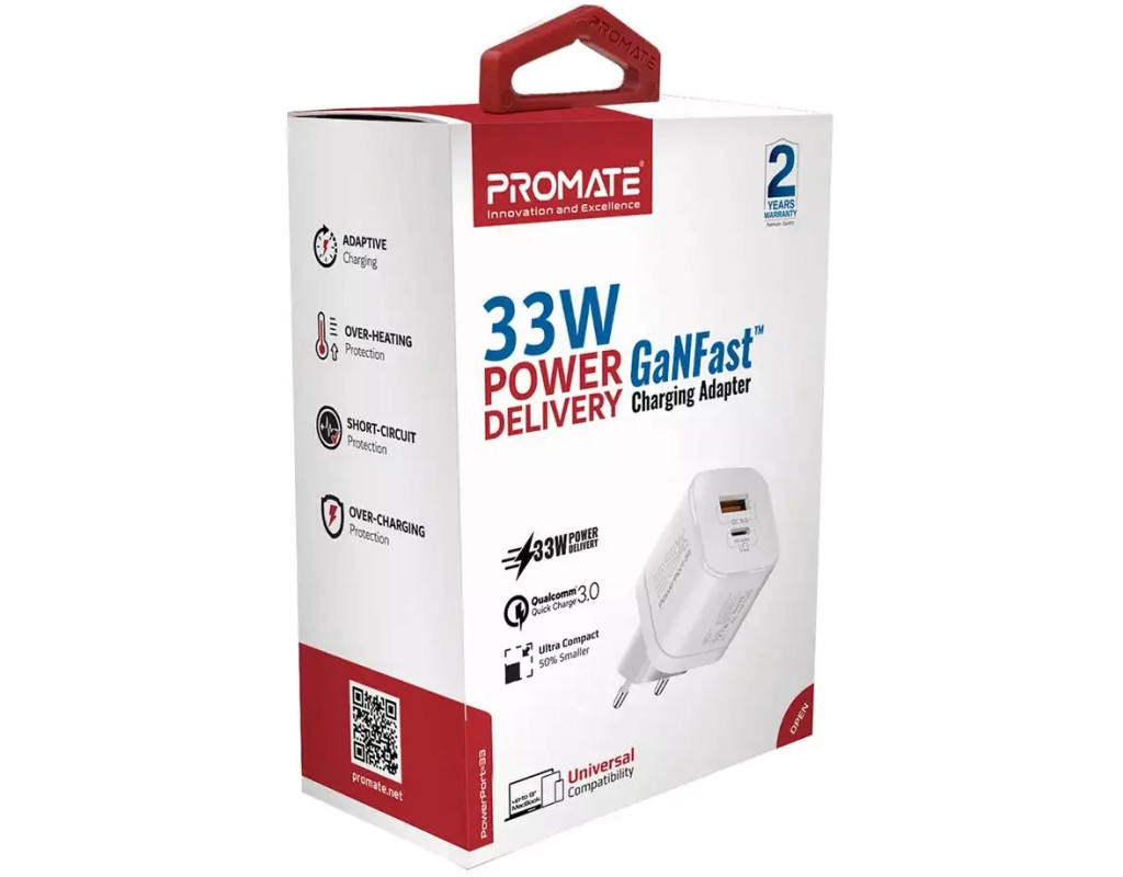 | Зарядное устройство Promate 33W USB-C + USB-A (powerport-33.white) — это воплощение инноваций в мире мобильной электроники. Благодаря использованию прогрессивной технологии GaNFast, этот адаптер эффективно преобразует энергию, увеличивая её эффективность на 40%. Компактный дизайн, который на 50% уменьшен благодаря нитриду галлия, делает его идеальным выбором для путешествий и повседневного использования. Высокое качество сборки и материалы премиум-класса гарантируют долгий срок службы вашего устройства. Поддержка технологий Power Delivery и Quick Charge 3.0 обеспечивает сверхбыструю зарядку различных гаджетов: смартфонов, планшетов, TWS наушников, фитнес-браслетов, геймпадов и даже современных ультрабуков. Благодаря двойным портам USB Type-C и USB-A, вы с легкостью можете заряжать сразу два устройства, минимизируя время ожидания. Максимальная выходная мощность в 33 Вт и максимальный ток 4.5 А позволяют заряжать устройства максимально быстро. С технологией USB-C 33 Вт Power Delivery 3.0 вы получаете шесть режимов зарядки, которые автоматически настраиваются под конкретные характеристики гаджета. USB-A Quick Charge 3.0 – это возможность зарядить аккумулятор на 3400 мА·ч менее чем за час. Безопасность ваших устройств гарантируется интегрированным чипом Smart IC, который защищает от нежелательных скачков напряжения, перегрева и коротких замыканий. Это означает, что вы всегда можете положиться на Promate PowerPort-33, наслаждаясь удобной, быстрой и безопасной зарядкой в любой момент. Выберите качество и инновации с Promate! |