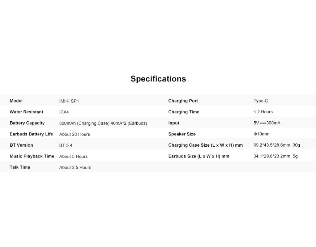 IMIKI SP1 – это стильные и удобные беспроводные наушники, предназначенные для комфорта и отличного звучания. Эргономичная форма обеспечивает удобную посадку, а легкая конструкция позволяет комфортно носить их в течение длительного времени. Компактный зарядный кейс имеет привлекательный дизайн и легко помещается в карман или сумку. Звук и технологии • Высококачественные динамики для чистого и сбалансированного звучания • Глубокие басы и четкие высокие частоты для качественного аудио • Передовая система шумоподавления, минимизирующая внешние шумы и улучшающая качество звонков Функциональность • Сенсорное управление для удобного переключения треков, приема вызовов и активации голосового помощника • Автоматическое подключение при открытии кейса • Стабильное соединение Bluetooth для бесперебойного звука без задержек • Микрофон высокого качества для четких телефонных разговоров Автономность и зарядка • Продолжительное время работы на одном заряде, что позволяет слушать музыку или разговаривать в течение нескольких часов • Компактный зарядный кейс с возможностью быстрой подзарядки • USB-C или беспроводная зарядка (в зависимости от модели) Почему стоит выбрать IMIKI SP1? Стильный дизайн и комфортная посадка Высококачественный звук с насыщенными басами Стабильное Bluetooth-соединение Удобное сенсорное управление Долговременная автономность IMIKI SP1 – это идеальный выбор для тех, кто ищет качественные беспроводные наушники с отличным звуком и удобным использованием! |