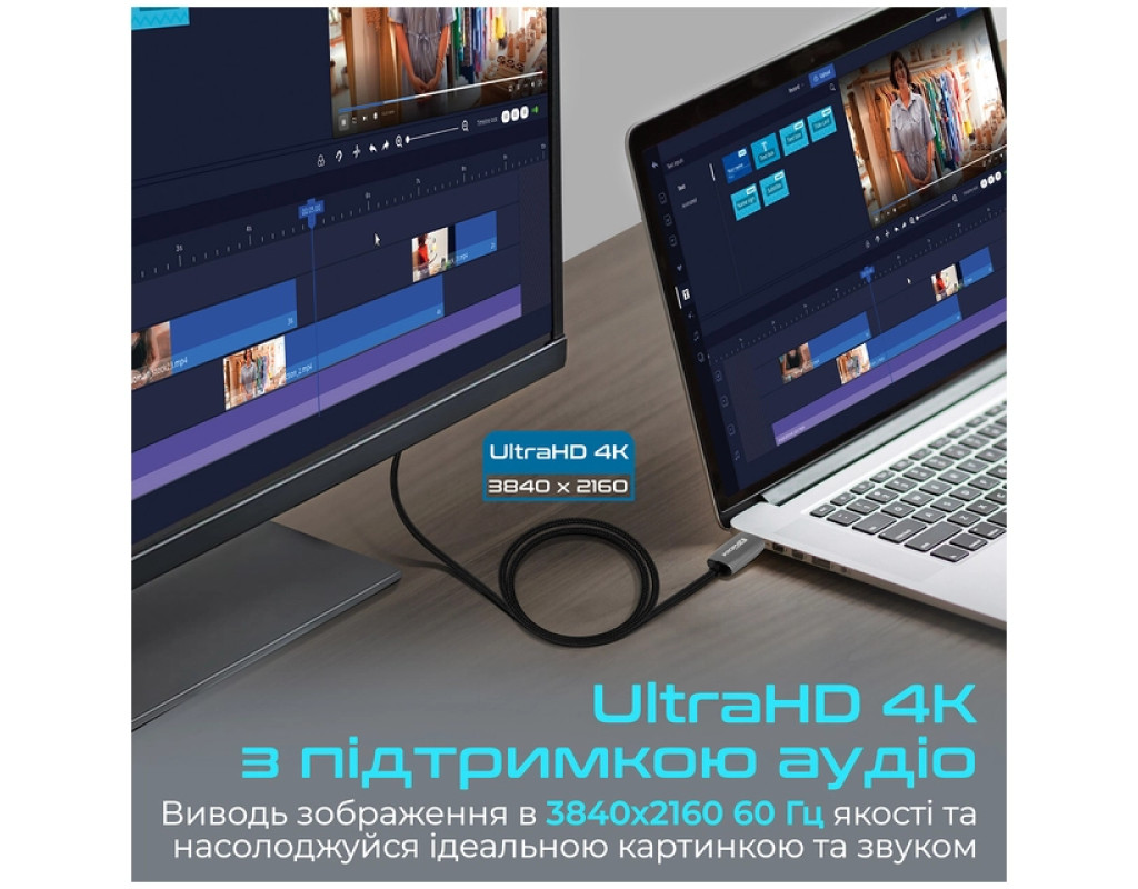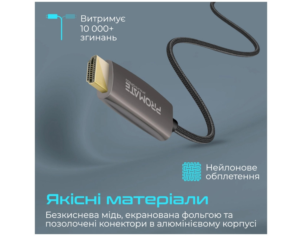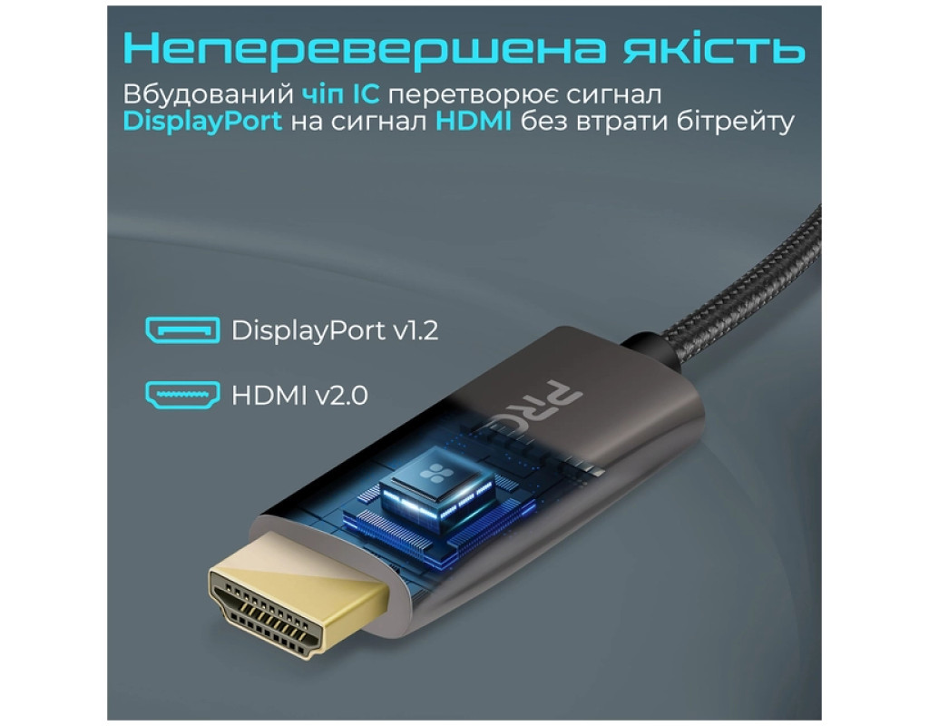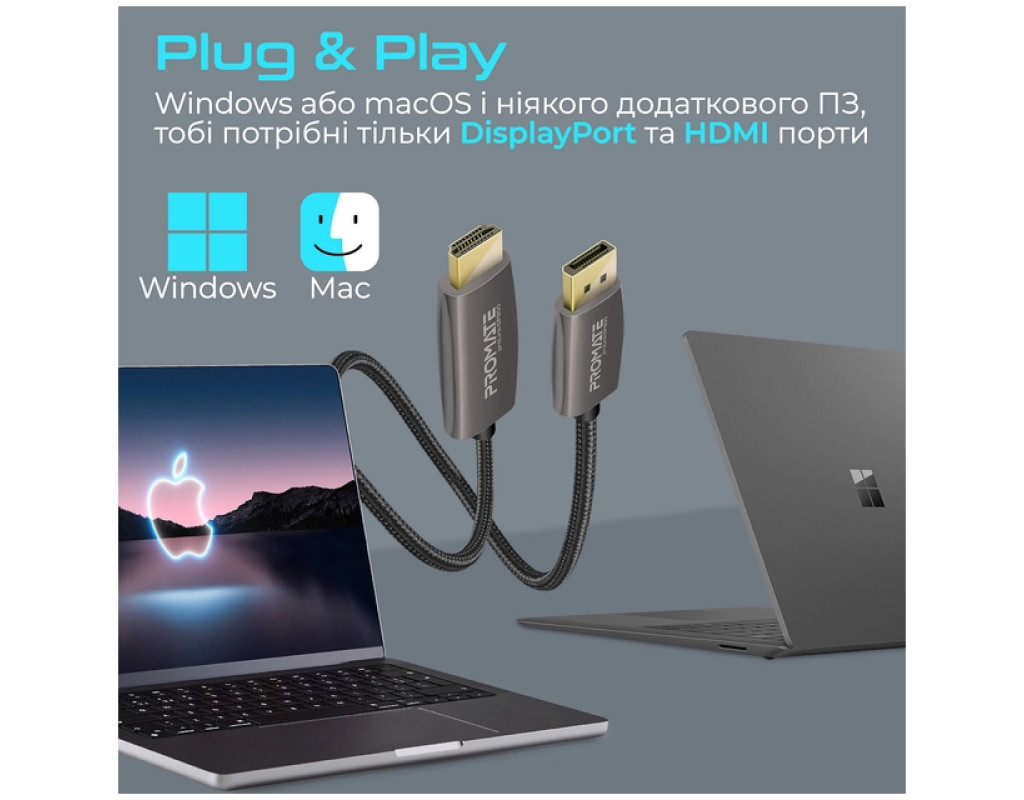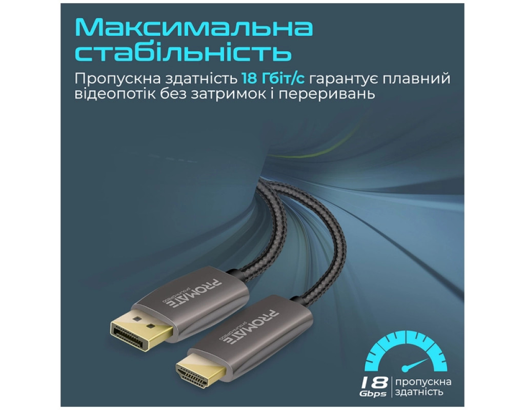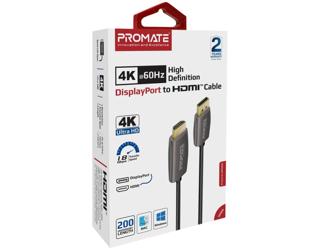 Promate ProLink-DP200 - премиальный DisplayPort to HDMI кабель в нейлоновой оплетке и с позолоченными коннекторами. Смотри фильмы и сериалы, слушай музыку или играй в видеоигры в разрешении 4K UHD 60 Гц без помех и потери качества. Особенности: - UltraHD 4K с поддержкой аудио: Выводи изображение в разрешении 3840x2160 60 Гц и наслаждайся идеальной картинкой и звуком.