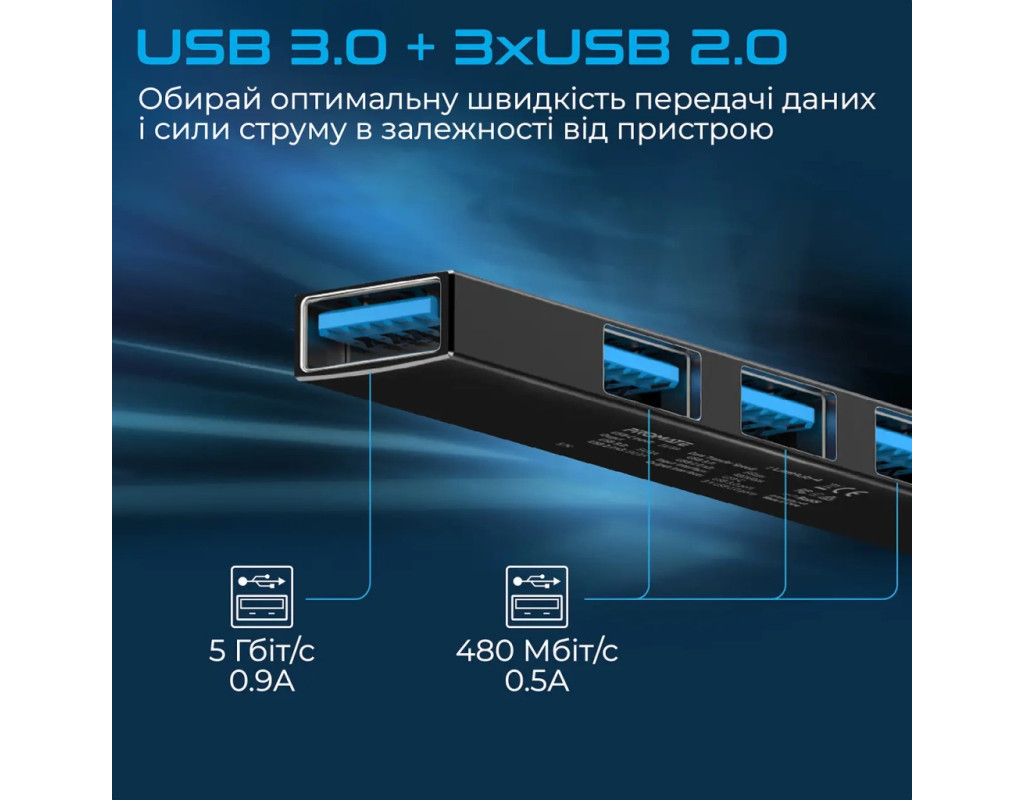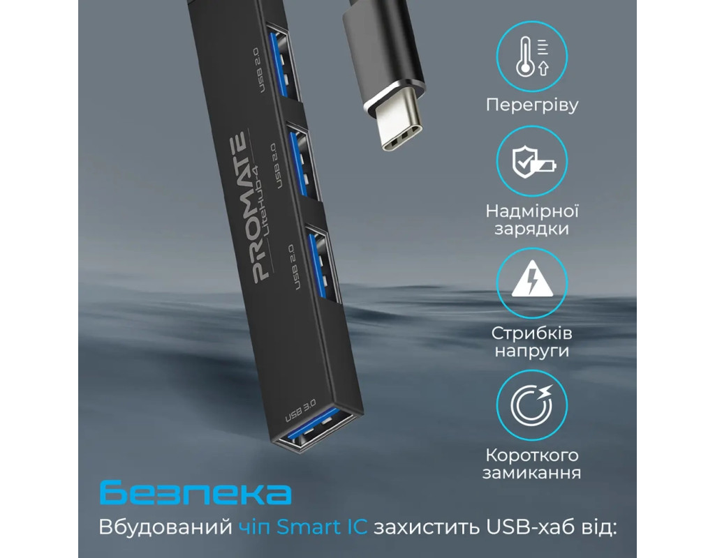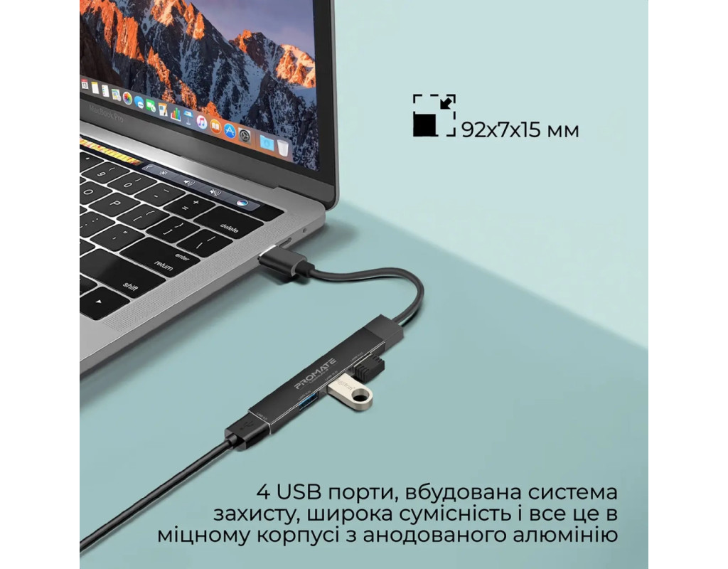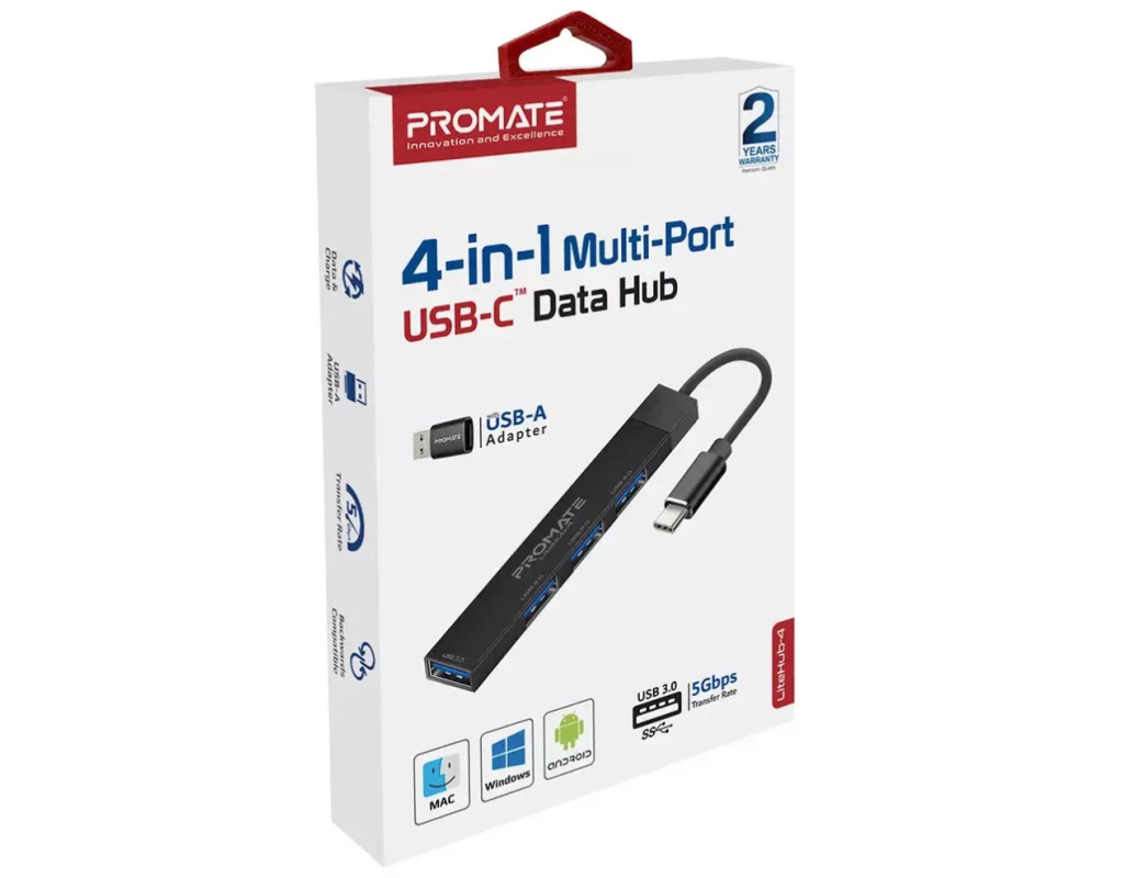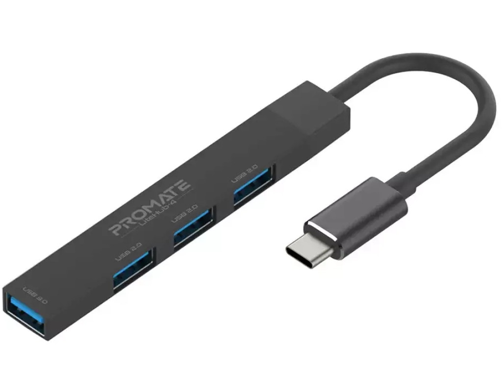 4 USB порта, встроенная система защиты, широкая совместимость и все это в ультракомпактном корпусе из анодированного алюминия. Promate LiteHub-4 - самый маленький в мире хаб с USB-C to USB-A адаптером, станет оптимальным решением на каждый день. Особенности: - USB 3.0 + 3xUSB 2.0: 5 Гбит/с и 0. 9А, или 480 Мбит/с и 0. 5А. Выбирай оптимальную скорость передачи данных и силы тока в зависимости от подключаемого устройства.