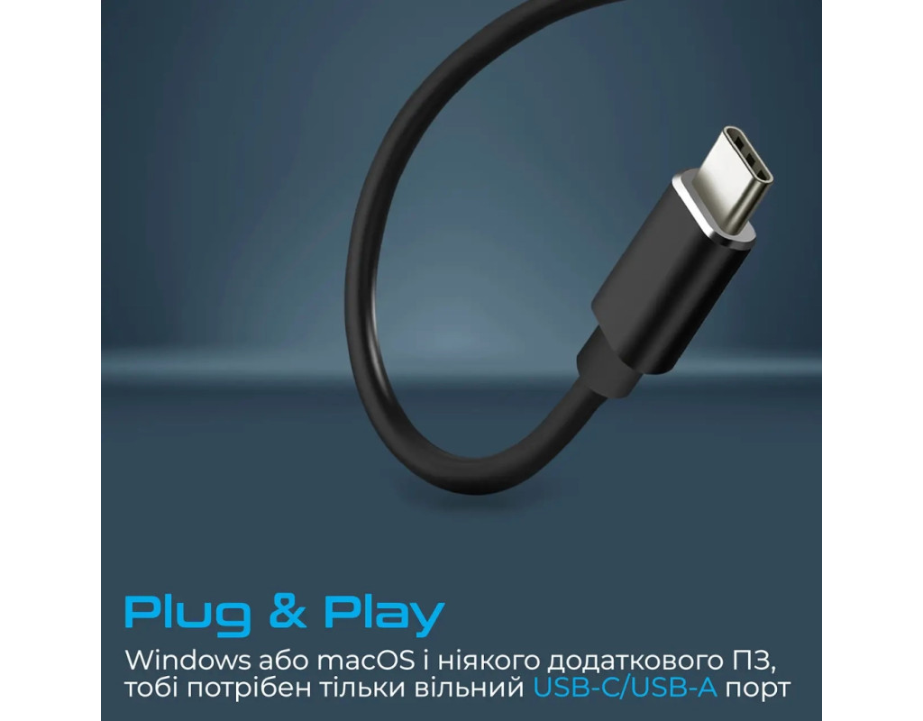 - Plug & Play: Windows или macOS (10.2 и выше) и никакого дополнительного ПО, тебе нужен только свободный USB-C или USB- A порт.