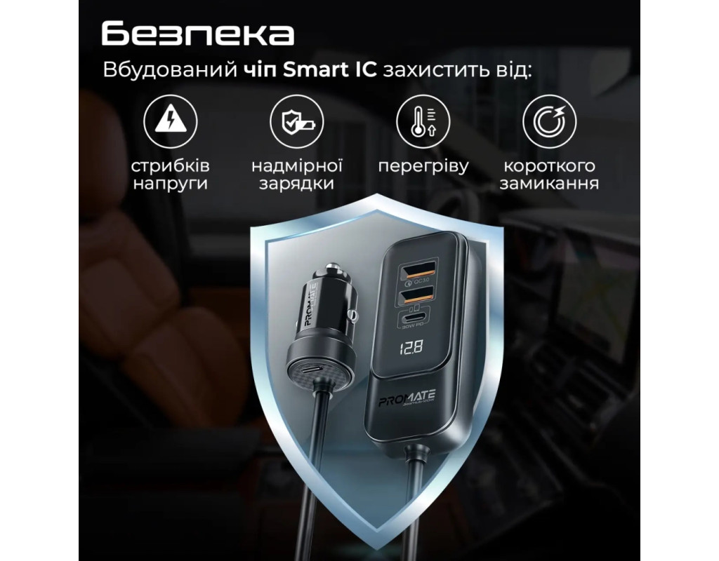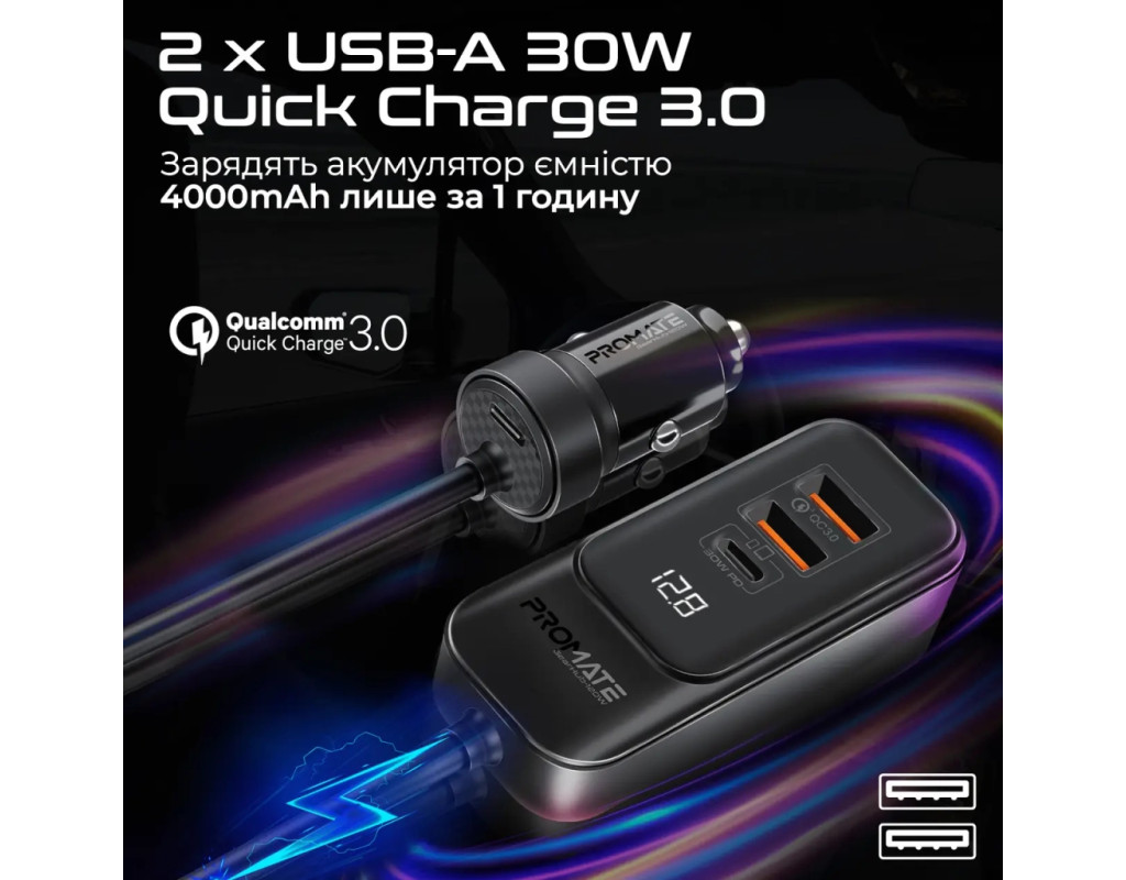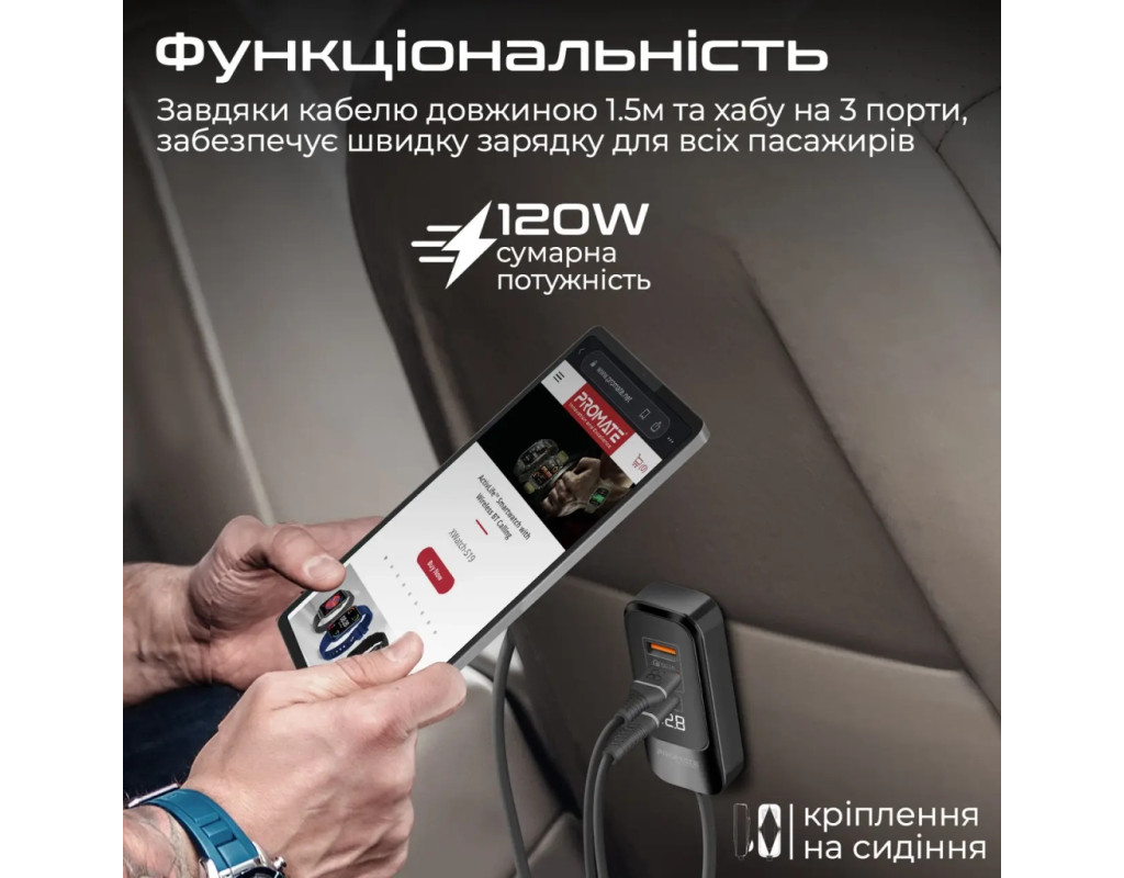Promate GearHub-120W - автомобильное зарядное устройство на 4 порта с поддержкой технологий Power Delivery и Quick Charge 3.0, суммарной мощностью 120W. Имеет хаб на 1.5-метровом кабеле, который позволяет заряжать девайсы пассажирам задних сидений, а водитель и передний пассажир могут воспользоваться встроенным USB-C портом зарядного в прикуривателе.