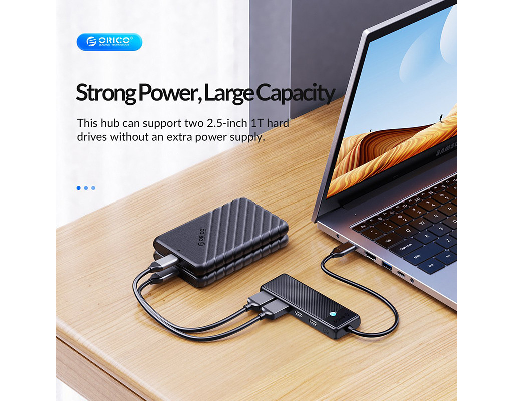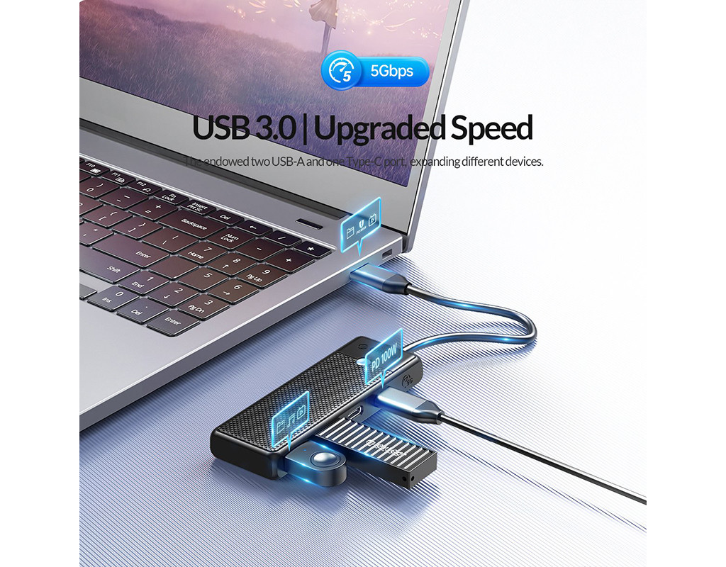 USB-концентратор Orico имеет разные выходные порты, которые отвечают всем вашим требованиям. Он оснащен 2 гнездовыми портами USB-A с максимальной скоростью 5 Гбит/с, 1 гнездовым портом USB-C с максимальной скоростью 5 Гбит/с и, вдобавок, гнездовым портом USB-C для зарядки по протоколу PD. (PD означает Power Delivery). Порт PD может заряжать до 100 Вт. Самое важное, что следует отметить, что USB-C PD это входной порт «мама», а не выходной порт. Это означает, что кабель, подключенный к концентратору, используемый для передачи данных, можно одновременно использовать для зарядки ноутбука или ноутбука, совместимого с USB-C PD, через тот же кабель. Характеристики: