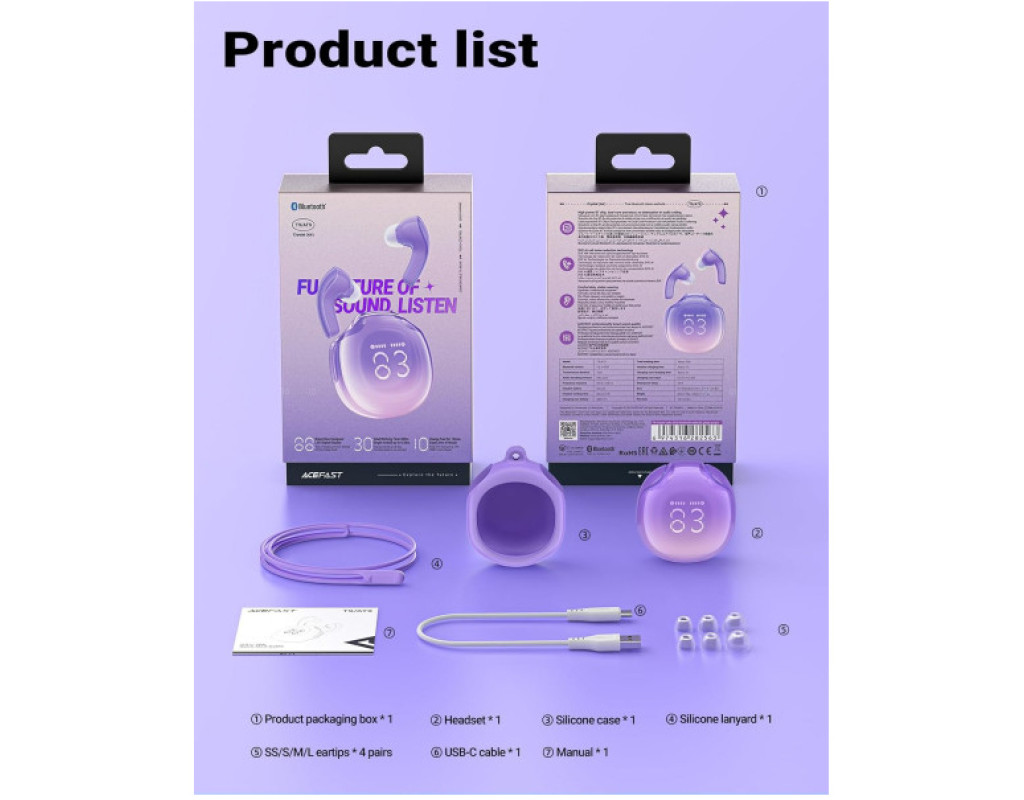 | Наушники Acefast T9 Grape Purple (6974316282563) — это ваш шанс открыть мир звука с совершеннейшим комфортом и превосходным качеством. Созданные в стиле TWS (True Wireless Stereo), они идеально подходят для тех, кто ищет беспроводную свободу при прослушивании любимых композиций или ведении телефонных разговоров. Этот гаджет идеально дополняет современный образ жизни благодаря стильному дизайну и инновационным технологиям. В основе Acefast T9 находится передовая версия Bluetooth 5.3, обеспечивающая стабильное и надежное беспроводное соединение с вашим телефоном или ноутбуком на расстоянии до 10 метров. Эта версия Bluetooth также известна экономичным энергопотреблением, позволяя наслаждаться четким и непрерывным аудиопотоком в течение 6.5 часов на одном заряде. Одной из уникальных особенностей этих наушников является их активное шумоподавление. Обеспечивая полное погружение в мир чистого звука, они эффективно блокируют окружающие шумы. Это позволяет сосредоточиться на насыщенных высоких нотах, четких средних частотах и мощных басах. Технология SVE AI улучшает качество передачи голоса, идеально подходит для шумных сред, таких как улицы или общественный транспорт. Наушники имеют вакуумную конструкцию с удобными силиконовыми амбушюрами, гарантирующими комфортное ношение без усталости даже в течение долгих периодов. Это обеспечивает отличную акустическую изоляцию и надежную фиксацию. Благодаря своей закрытой акустической конструкции, вы сможете полностью погрузиться в мир звука без потери деталей. Для вашего удобства, Acefast T9 оснащены встроенным микрофоном и сенсорным управлением, что позволяет легко контролировать громкость, переключать треки и отвечать на звонки без лишних усилий. Сенсорное управление чрезвычайно чувствительно, что добавляет удобства в эксплуатации во время активного образа жизни, будь то тренировка или прогулка по городу. Надежные и стильные, наушники выполнены в привлекательном цвете Grape Purple, который добавит яркости вашему образу. Они также отличаются стойкостью к влаге, соответствуя стандарту IPX4. Теперь вы можете слушать музыку даже в дождливую погоду или во время спортивных занятий, не беспокоясь о сохранности устройства. Время работы от встроенной батареи составляет 6.5 часов, однако с зарядным кейсом, поддерживающим интерфейс USB Type-C, автономная жизнь наушников продлевается до 30 часов. Быстрая зарядка занимает всего 10 минут и предоставляет дополнительные часы прослушивания, а полная зарядка занимает всего час. Легкие и компактные, весом всего 43 г, Acefast T9 Grape Purple не станут лишним весом в вашей сумке. Совмещая современный стиль, высококлассный комфорт и безупречное качество звука, они обязательно станут вашим надежным спутником каждый день, добавляя красок в вашу жизнь ритмом любимой музыки. |