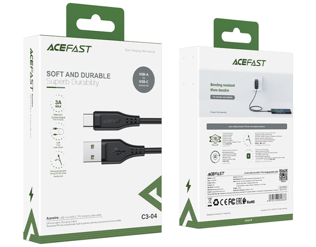 Дата кабель USB 2.0 AM to USB-C 1.2m 3.0A TPE Black Acefast (6974316280866)