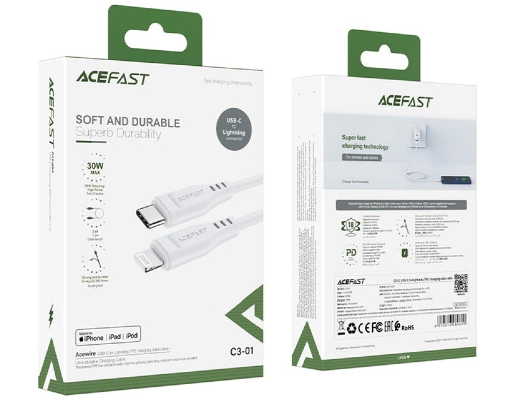 Дата кабель USB-C to Lightning 1.2m 3.0A TPE C3-01 White Acefast (6974316280811)
