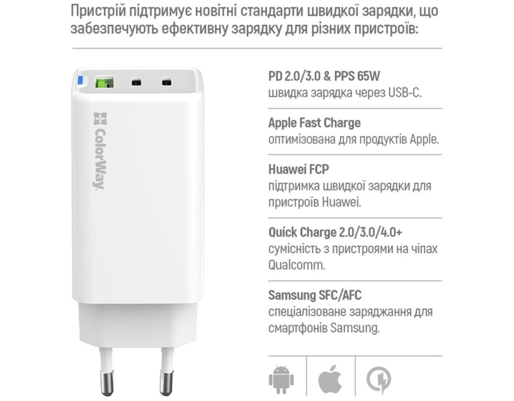 | Зарядное устройство ColorWay GaN Mini 65W PD Port PPS USB (USB-2C1A) в изящном белом корпусе — это воплощение инновационности и эффективности в мире зарядных устройств. Изготовленный из высококачественных материалов, этот прибор обеспечивает долговечность и высокую производительность, которые ожидают современные пользователи. Благодаря мощности в 65 Вт, этот сетевой адаптер способен быстро заряжать не только ваши смартфоны и планшеты, но и такие энергоемкие устройства, как ноутбуки, экшн-камеры и геймпады. Оснащенный тремя портами — 2 x USB Type C и 1 x USB, он предоставляет возможность одновременного подключения нескольких гаджетов, что делает его бесценным спутником в динамичном ритме жизни современного человека. Система поддерживает передовые технологии быстрой зарядки, включая Quick Charge 2.0, 3.0 и 4.0, а также Power Delivery 2.0 и 3.0, вместе с технологией Programmable Power Supply (PPS). Это позволяет максимально эффективно использовать зарядный потенциал для множества различных гаджетов. Инновационное использование нитрида галлия (GaN), в отличие от традиционных кремниевых компонентов, повышает энергоэффективность и уменьшает нагрев устройства во время работы. Встроенная интеллектуальная система управления защищает от перегрузок, скачков напряжения, коротких замыканий и перегрева, гарантируя безопасность и надежность во время зарядки. ColorWay GaN Mini 65W PD — оптимальное решение для тех, кто ценит качество, комфорт и инновации, выделяя каждую деталь своего "девайсного" двойника. Это идеальный выбор для тех, кто ищет максимальный комфорт, эффективность и безопасность в компактном форм-факторе. |