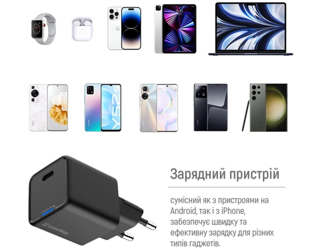 Сетевое зарядное устройство Colorway GaN Mini 25W PD Port PPS USB-C – это современный, компактный и мощный адаптер, поддерживающий передовые технологии быстрой зарядки: Super Fast Charging PD 3.0 25W PPS, Apple Fast Charge, PD 2.0 & 3.0 PPS 25W, 0/4. AFC выходной мощностью до 25 Вт. Компактный размер и эргономичный дизайн делают это зарядное устройство идеальным для повседневного использования и путешествий. Благодаря технологии GaN (нитрид галлия) устройство стало более легким, меньшим и эффективным по сравнению с обычными адаптерами. Colorway GaN Mini почти не нагревается при работе, потребляет меньше энергии и значительно ускоряет зарядку устройств. Интеллектуальная микросхема USB Auto ID автоматически распознает подключенное устройство и подбирает оптимальное напряжение и силу тока до 3A, что обеспечивает максимально эффективную зарядку. Устройство совместимо с большинством современных брендов смартфонов, планшетов и других гаджетов. Дополнительно адаптер оснащен системой многоуровневой защиты от короткого замыкания, перегрева, перенапряжения и перегрузок по току. Корпус, изготовленный из огнестойкого ABS-пластика, отличается стойкостью к царапинам и ударам, обеспечивая надежность и длительный срок службы даже при интенсивном использовании. Благодаря компактным размерам и малому весу устройство легко помещается в карман или сумку, что делает его удобным для транспортировки. Colorway GaN Mini – идеальный выбор для быстрой и безопасной зарядки ваших устройств как дома, так и во время путешествий. |