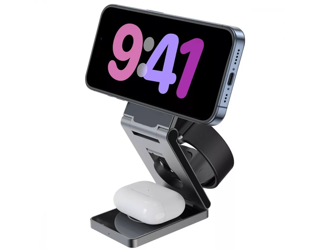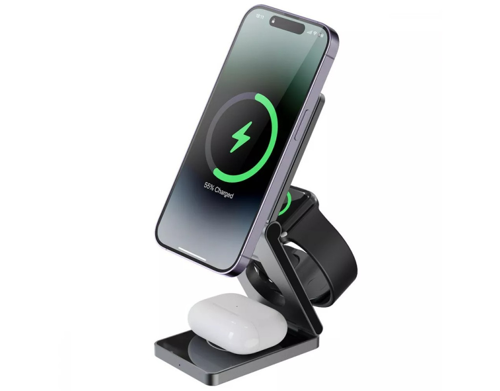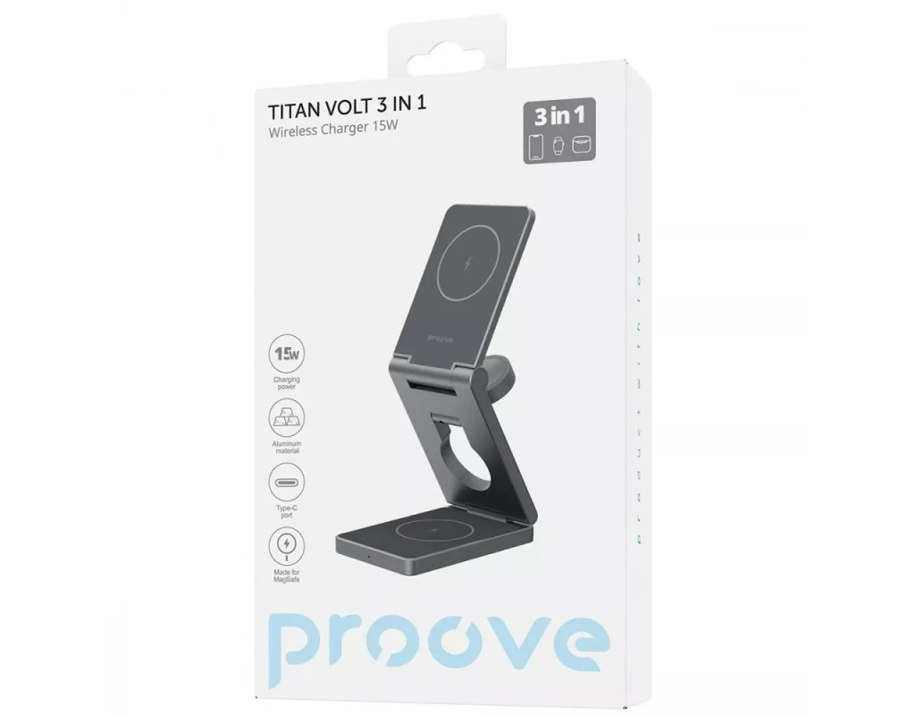 | Proove Titan Volt 3in1 поможет зарядить сразу три разных устройства без потери мощности. Гаджет имеет 3 разные точки контакта: для часов, наушников и смартфона, компактно размещенных и не мешающих друг другу.