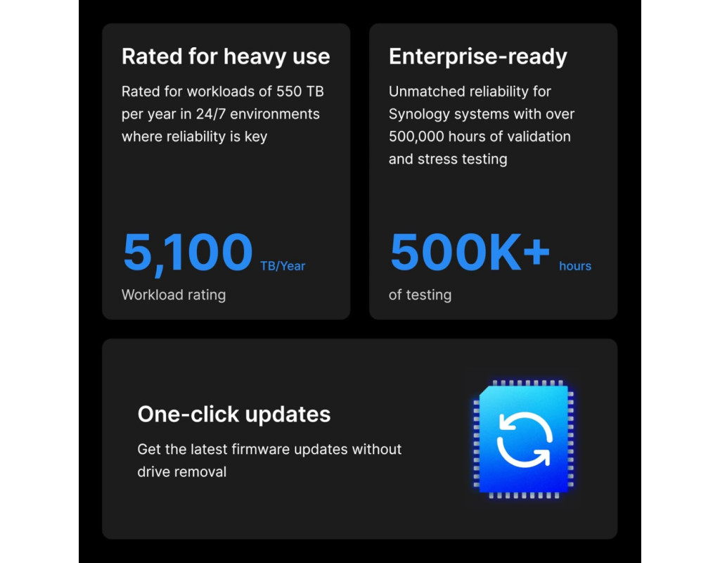 Накопители корпоративного класса для Synology Жесткий диск (HDD) Synology HAT5300 обеспечивает лучшую в своем классе производительность благодаря тесной интеграции с Synology DSM и аппаратным обеспечением. Благодаря более чем 500 000 часам внутреннего тестирования и 5-летней ограниченной гарантии от Synology , серия HAT5300 обеспечивает непревзойденную надежность в развертываниях Synology. Последовательное масштабирование производительности Благодаря тестированию и оптимизации жесткие диски HAT5300 были оптимизированы, чтобы обеспечить на 23% более высокую стабильную производительность последовательного чтения в требовательных многопользовательских средах. Параметры тестирования на выносливость Благодаря более чем 500 000 часам тестирования на выносливость на устройствах Synology , диски HAT5300 гарантированно выдерживают нагрузку даже в самых требовательных корпоративных средах, обеспечивая высокую производительность. Обновление микропрограммы одним щелчком мыши Автоматические уведомления об обновлении микропрограммы и установка в DSM одним щелчком мыши уменьшают нагрузку на обслуживание и снижают вероятность ошибок. Долговечность в условиях 24/7 Благодаря среднему времени наработки на отказ составляет 2.5 млн часов, жесткие диски серии HAT5300 поддерживают рабочие нагрузки объемом 550 ТБ в год, а технология кэш-памяти с постоянной записью минимизирует повреждение данных в случае внезапного отключение электроэнергии. |