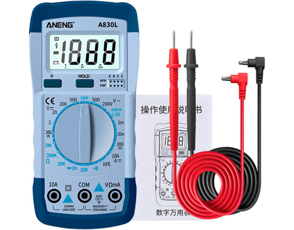 Мультиметр Aneng AN-A830L — это простой и доступный прибор для измерения основных параметров электрических цепей. С его помощью вы можете измерить напряжение, силу тока и сопротивление. Мультиметр имеет небольшой размер и вес, что делает его удобным для переноски и хранения. Мультиметр имеет ручной выбор диапазона измерения и функцию удержания данных. Мультиметр Aneng AN-A830L подходит для начинающих электриков, а также для домашнего использования. С этим прибором вы сможете выполнять простые задачи по проверке и ремонту электронной техники. Основные характеристики мультиметра Aneng AN-A830L: